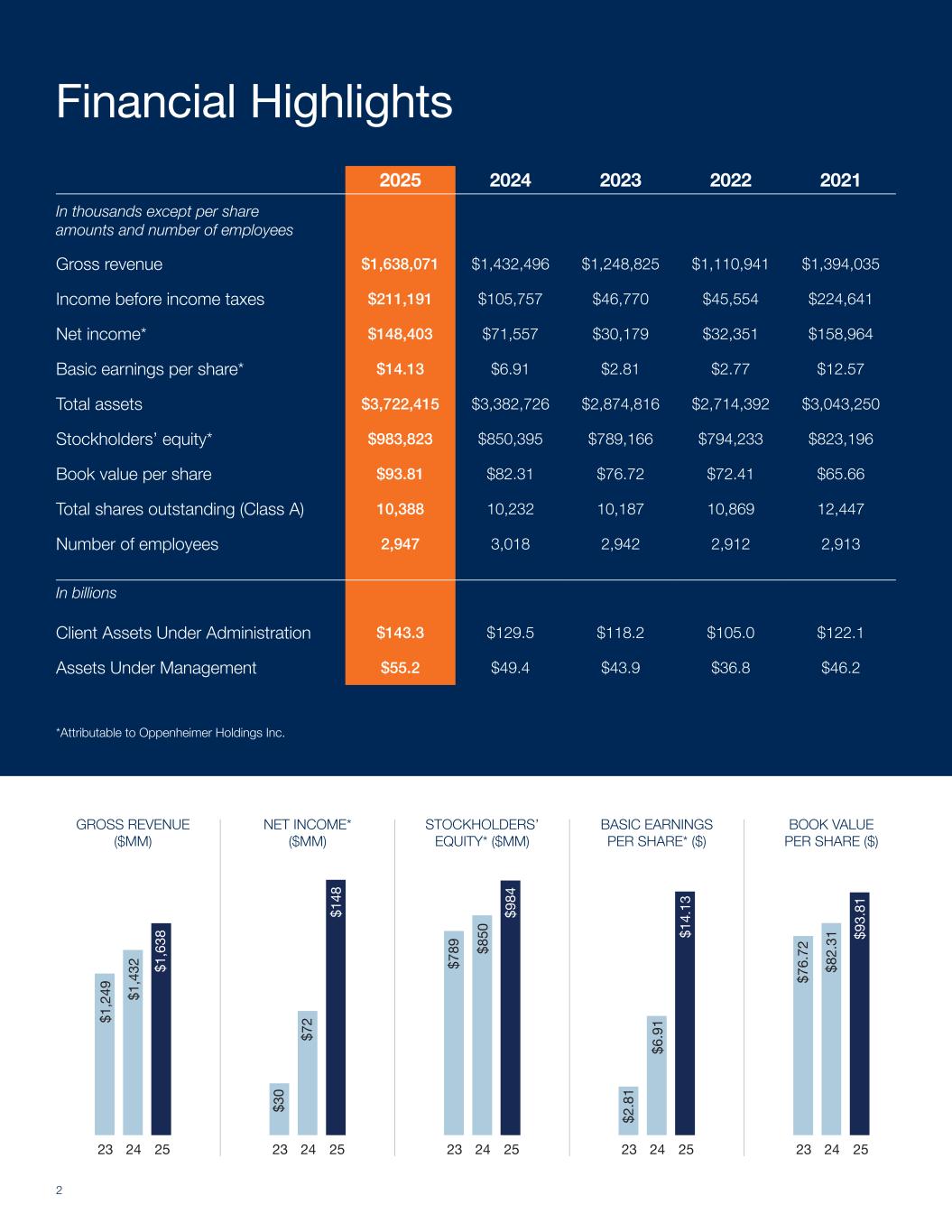 252423 $8 2. 31 $9 3. 81 $7 6. 72 2025 2024 2023 2022 2021 In thousands except per share amounts and number of employees Gross revenue $1,638,071 $1,432,496 $1,248,825 $1,110,941 $1,394,035 Income before income taxes $211,191 $105,757 $46,770 $45,554 $224,641 Net income* $148,403 $71,557 $30,179 $32,351 $158,964 Basic earnings per share* $14.13 $6.91 $2.81 $2.77 $12.57 Total assets $3,722,415 $3,382,726 $2,874,816 $2,714,392 $3,043,250 Stockholders’ equity* $983,823 $850,395 $789,166 $794,233 $823,196 Book value per share $93.81 $82.31 $76.72 $72.41 $65.66 Total shares outstanding (Class A) 10,388 10,232 10,187 10,869 12,447 Number of employees 2,947 3,018 2,942 2,912 2,913 In billions Client Assets Under Administration $143.3 $129.5 $118.2 $105.0 $122.1 Assets Under Management $55.2 $49.4 $43.9 $36.8 $46.2 Financial Highlights GROSS REVENUE ($MM) NET INCOME* ($MM) BASIC EARNINGS PER SHARE* ($) STOCKHOLDERS’ EQUITY* ($MM) *Attributable to Oppenheimer Holdings Inc. BOOK VALUE PER SHARE ($) 252423 $7 2 $3 0 $1 48 252423 $8 50 $9 84 $7 89 252423 $6 .9 1 $1 4. 13 $2 .8 1 252423 $1 ,6 38 $1 ,4 32 $1 ,2 49 2