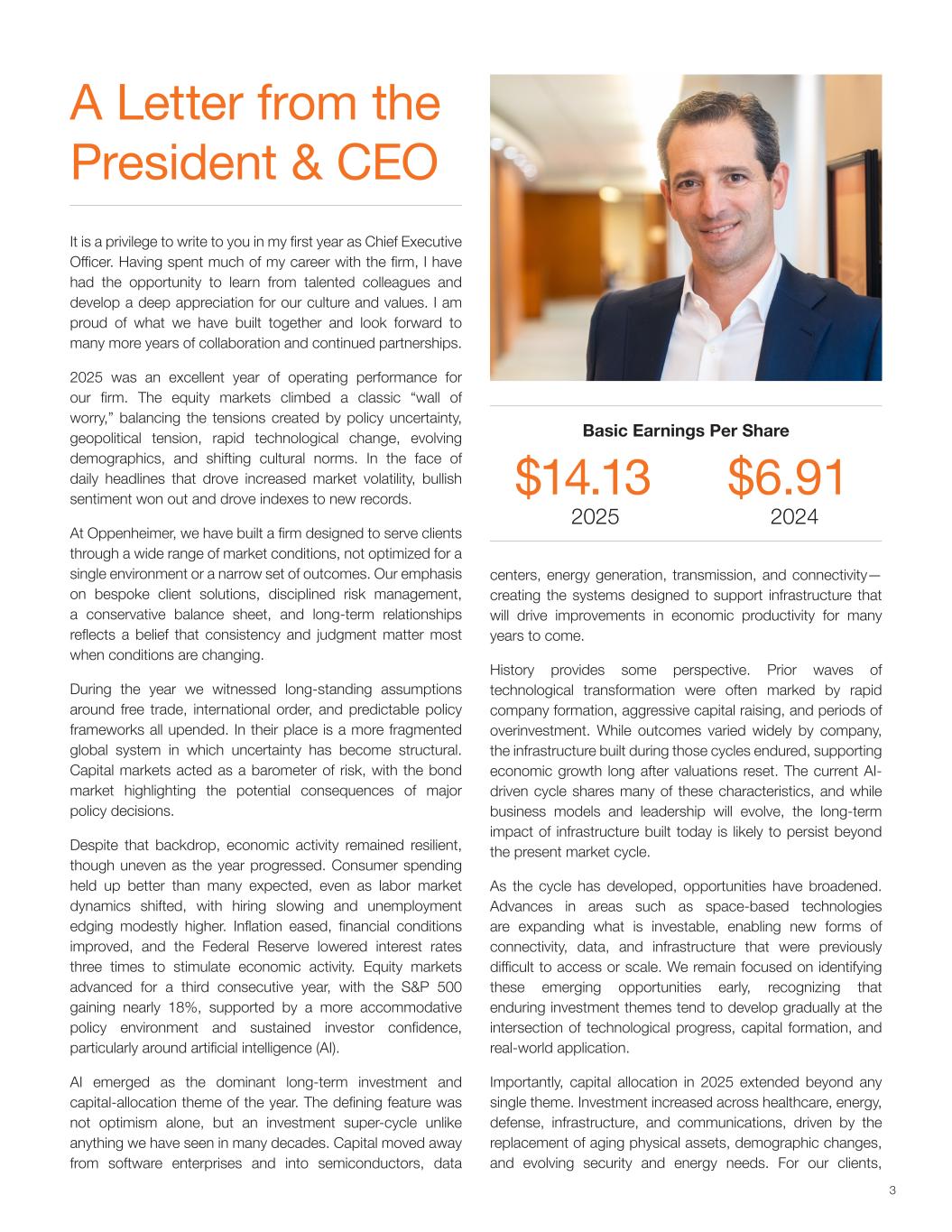 A Letter from the President & CEO Basic Earnings Per Share $14.13 2025 $6.91 2024 3 It is a privilege to write to you in my first year as Chief Executive Officer. Having spent much of my career with the firm, I have had the opportunity to learn from talented colleagues and develop a deep appreciation for our culture and values. I am proud of what we have built together and look forward to many more years of collaboration and continued partnerships. 2025 was an excellent year of operating performance for our firm. The equity markets climbed a classic “wall of worry,” balancing the tensions created by policy uncertainty, geopolitical tension, rapid technological change, evolving demographics, and shifting cultural norms. In the face of daily headlines that drove increased market volatility, bullish sentiment won out and drove indexes to new records. At Oppenheimer, we have built a firm designed to serve clients through a wide range of market conditions, not optimized for a single environment or a narrow set of outcomes. Our emphasis on bespoke client solutions, disciplined risk management, a conservative balance sheet, and long-term relationships reflects a belief that consistency and judgment matter most when conditions are changing. During the year we witnessed long-standing assumptions around free trade, international order, and predictable policy frameworks all upended. In their place is a more fragmented global system in which uncertainty has become structural. Capital markets acted as a barometer of risk, with the bond market highlighting the potential consequences of major policy decisions. Despite that backdrop, economic activity remained resilient, though uneven as the year progressed. Consumer spending held up better than many expected, even as labor market dynamics shifted, with hiring slowing and unemployment edging modestly higher. Inflation eased, financial conditions improved, and the Federal Reserve lowered interest rates three times to stimulate economic activity. Equity markets advanced for a third consecutive year, with the S&P 500 gaining nearly 18%, supported by a more accommodative policy environment and sustained investor confidence, particularly around artificial intelligence (AI). AI emerged as the dominant long-term investment and capital-allocation theme of the year. The defining feature was not optimism alone, but an investment super-cycle unlike anything we have seen in many decades. Capital moved away from software enterprises and into semiconductors, data centers, energy generation, transmission, and connectivity— creating the systems designed to support infrastructure that will drive improvements in economic productivity for many years to come. History provides some perspective. Prior waves of technological transformation were often marked by rapid company formation, aggressive capital raising, and periods of overinvestment. While outcomes varied widely by company, the infrastructure built during those cycles endured, supporting economic growth long after valuations reset. The current AI- driven cycle shares many of these characteristics, and while business models and leadership will evolve, the long-term impact of infrastructure built today is likely to persist beyond the present market cycle. As the cycle has developed, opportunities have broadened. Advances in areas such as space-based technologies are expanding what is investable, enabling new forms of connectivity, data, and infrastructure that were previously difficult to access or scale. We remain focused on identifying these emerging opportunities early, recognizing that enduring investment themes tend to develop gradually at the intersection of technological progress, capital formation, and real-world application. Importantly, capital allocation in 2025 extended beyond any single theme. Investment increased across healthcare, energy, defense, infrastructure, and communications, driven by the replacement of aging physical assets, demographic changes, and evolving security and energy needs. For our clients,