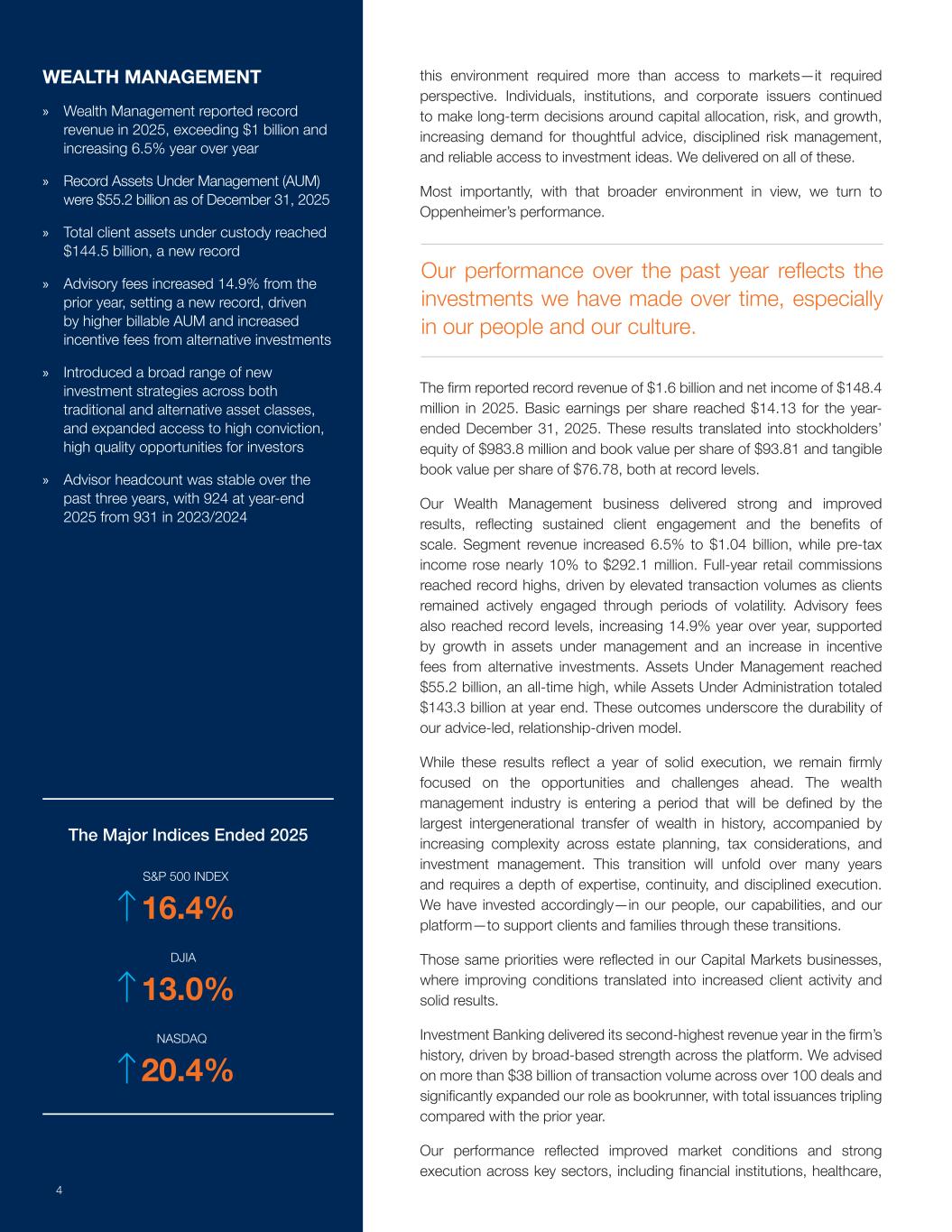 this environment required more than access to markets—it required perspective. Individuals, institutions, and corporate issuers continued to make long-term decisions around capital allocation, risk, and growth, increasing demand for thoughtful advice, disciplined risk management, and reliable access to investment ideas. We delivered on all of these. Most importantly, with that broader environment in view, we turn to Oppenheimer’s performance. The firm reported record revenue of $1.6 billion and net income of $148.4 million in 2025. Basic earnings per share reached $14.13 for the year- ended December 31, 2025. These results translated into stockholders’ equity of $983.8 million and book value per share of $93.81 and tangible book value per share of $76.78, both at record levels. Our Wealth Management business delivered strong and improved results, reflecting sustained client engagement and the benefits of scale. Segment revenue increased 6.5% to $1.04 billion, while pre-tax income rose nearly 10% to $292.1 million. Full-year retail commissions reached record highs, driven by elevated transaction volumes as clients remained actively engaged through periods of volatility. Advisory fees also reached record levels, increasing 14.9% year over year, supported by growth in assets under management and an increase in incentive fees from alternative investments. Assets Under Management reached $55.2 billion, an all-time high, while Assets Under Administration totaled $143.3 billion at year end. These outcomes underscore the durability of our advice-led, relationship-driven model. While these results reflect a year of solid execution, we remain firmly focused on the opportunities and challenges ahead. The wealth management industry is entering a period that will be defined by the largest intergenerational transfer of wealth in history, accompanied by increasing complexity across estate planning, tax considerations, and investment management. This transition will unfold over many years and requires a depth of expertise, continuity, and disciplined execution. We have invested accordingly—in our people, our capabilities, and our platform—to support clients and families through these transitions. Those same priorities were reflected in our Capital Markets businesses, where improving conditions translated into increased client activity and solid results. Investment Banking delivered its second-highest revenue year in the firm’s history, driven by broad-based strength across the platform. We advised on more than $38 billion of transaction volume across over 100 deals and significantly expanded our role as bookrunner, with total issuances tripling compared with the prior year. Our performance reflected improved market conditions and strong execution across key sectors, including financial institutions, healthcare, WEALTH MANAGEMENT » Wealth Management reported record revenue in 2025, exceeding $1 billion and increasing 6.5% year over year » Record Assets Under Management (AUM) were $55.2 billion as of December 31, 2025 » Total client assets under custody reached $144.5 billion, a new record » Advisory fees increased 14.9% from the prior year, setting a new record, driven by higher billable AUM and increased incentive fees from alternative investments » Introduced a broad range of new investment strategies across both traditional and alternative asset classes, and expanded access to high conviction, high quality opportunities for investors » Advisor headcount was stable over the past three years, with 924 at year-end 2025 from 931 in 2023/2024 The Major Indices Ended 2025 S&P 500 INDEX 16.4% DJIA 13.0% NASDAQ 20.4% Our performance over the past year reflects the investments we have made over time, especially in our people and our culture. 4