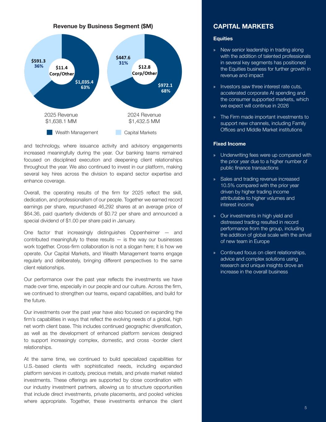 Capital MarketsWealth Management Revenue by Business Segment ($M) 2025 Revenue $1,638.1 MM 2024 Revenue $1,432.5 MM and technology, where issuance activity and advisory engagements increased meaningfully during the year. Our banking teams remained focused on disciplined execution and deepening client relationships throughout the year. We also continued to invest in our platform, making several key hires across the division to expand sector expertise and enhance coverage. Overall, the operating results of the firm for 2025 reflect the skill, dedication, and professionalism of our people. Together we earned record earnings per share, repurchased 46,292 shares at an average price of $64.36, paid quarterly dividends of $0.72 per share and announced a special dividend of $1.00 per share paid in January. One factor that increasingly distinguishes Oppenheimer — and contributed meaningfully to these results — is the way our businesses work together. Cross-firm collaboration is not a slogan here; it is how we operate. Our Capital Markets, and Wealth Management teams engage regularly and deliberately, bringing different perspectives to the same client relationships. Our performance over the past year reflects the investments we have made over time, especially in our people and our culture. Across the firm, we continued to strengthen our teams, expand capabilities, and build for the future. Our investments over the past year have also focused on expanding the firm’s capabilities in ways that reflect the evolving needs of a global, high net worth client base. This includes continued geographic diversification, as well as the development of enhanced platform services designed to support increasingly complex, domestic, and cross -border client relationships. At the same time, we continued to build specialized capabilities for U.S.-based clients with sophisticated needs, including expanded platform services in custody, precious metals, and private market related investments. These offerings are supported by close coordination with our industry investment partners, allowing us to structure opportunities that include direct investments, private placements, and pooled vehicles where appropriate. Together, these investments enhance the client CAPITAL MARKETS Equities » New senior leadership in trading along with the addition of talented professionals in several key segments has positioned the Equities business for further growth in revenue and impact » Investors saw three interest rate cuts, accelerated corporate AI spending and the consumer supported markets, which we expect will continue in 2026 » The Firm made important investments to support new channels, including Family Offices and Middle Market institutions Fixed Income » Underwriting fees were up compared with the prior year due to a higher number of public finance transactions » Sales and trading revenue increased 10.5% compared with the prior year driven by higher trading income attributable to higher volumes and interest income » Our investments in high yield and distressed trading resulted in record performance from the group, including the addition of global scale with the arrival of new team in Europe » Continued focus on client relationships, advice and complex solutions using research and unique insights drove an increase in the overall business 5