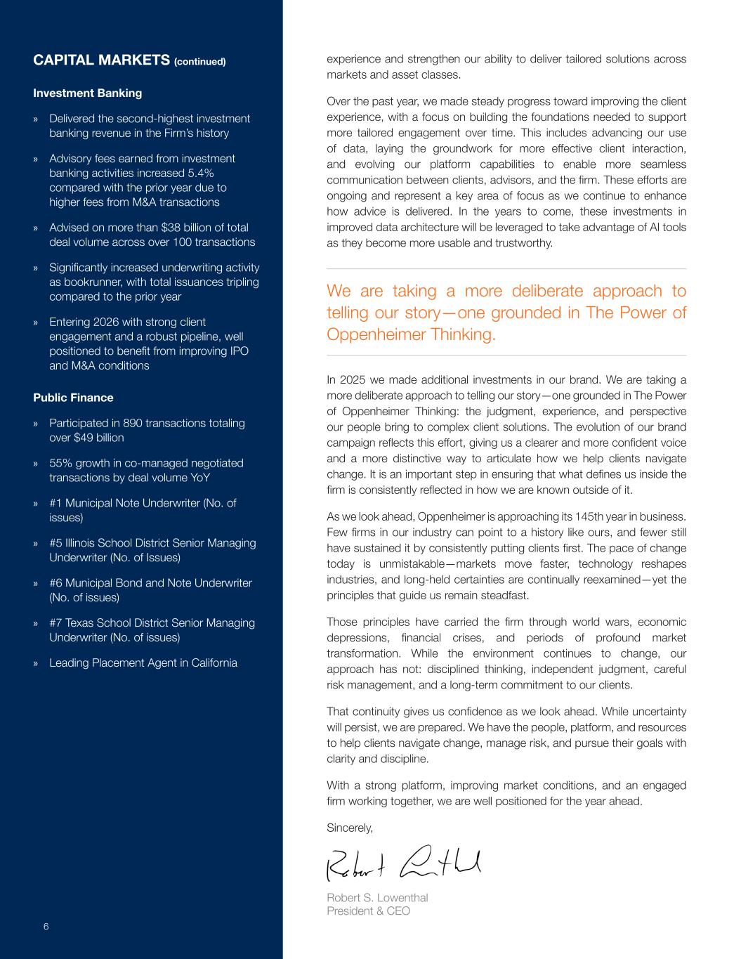 Robert S. Lowenthal President & CEO experience and strengthen our ability to deliver tailored solutions across markets and asset classes. Over the past year, we made steady progress toward improving the client experience, with a focus on building the foundations needed to support more tailored engagement over time. This includes advancing our use of data, laying the groundwork for more effective client interaction, and evolving our platform capabilities to enable more seamless communication between clients, advisors, and the firm. These efforts are ongoing and represent a key area of focus as we continue to enhance how advice is delivered. In the years to come, these investments in improved data architecture will be leveraged to take advantage of AI tools as they become more usable and trustworthy. In 2025 we made additional investments in our brand. We are taking a more deliberate approach to telling our story—one grounded in The Power of Oppenheimer Thinking: the judgment, experience, and perspective our people bring to complex client solutions. The evolution of our brand campaign reflects this effort, giving us a clearer and more confident voice and a more distinctive way to articulate how we help clients navigate change. It is an important step in ensuring that what defines us inside the firm is consistently reflected in how we are known outside of it. As we look ahead, Oppenheimer is approaching its 145th year in business. Few firms in our industry can point to a history like ours, and fewer still have sustained it by consistently putting clients first. The pace of change today is unmistakable—markets move faster, technology reshapes industries, and long-held certainties are continually reexamined—yet the principles that guide us remain steadfast. Those principles have carried the firm through world wars, economic depressions, financial crises, and periods of profound market transformation. While the environment continues to change, our approach has not: disciplined thinking, independent judgment, careful risk management, and a long-term commitment to our clients. That continuity gives us confidence as we look ahead. While uncertainty will persist, we are prepared. We have the people, platform, and resources to help clients navigate change, manage risk, and pursue their goals with clarity and discipline. With a strong platform, improving market conditions, and an engaged firm working together, we are well positioned for the year ahead. Sincerely, CAPITAL MARKETS (continued) Investment Banking » Delivered the second-highest investment banking revenue in the Firm’s history » Advisory fees earned from investment banking activities increased 5.4% compared with the prior year due to higher fees from M&A transactions » Advised on more than $38 billion of total deal volume across over 100 transactions » Significantly increased underwriting activity as bookrunner, with total issuances tripling compared to the prior year » Entering 2026 with strong client engagement and a robust pipeline, well positioned to benefit from improving IPO and M&A conditions Public Finance » Participated in 890 transactions totaling over $49 billion » 55% growth in co-managed negotiated transactions by deal volume YoY » #1 Municipal Note Underwriter (No. of issues) » #5 Illinois School District Senior Managing Underwriter (No. of Issues) » #6 Municipal Bond and Note Underwriter (No. of issues) » #7 Texas School District Senior Managing Underwriter (No. of issues) » Leading Placement Agent in California We are taking a more deliberate approach to telling our story—one grounded in The Power of Oppenheimer Thinking. 6