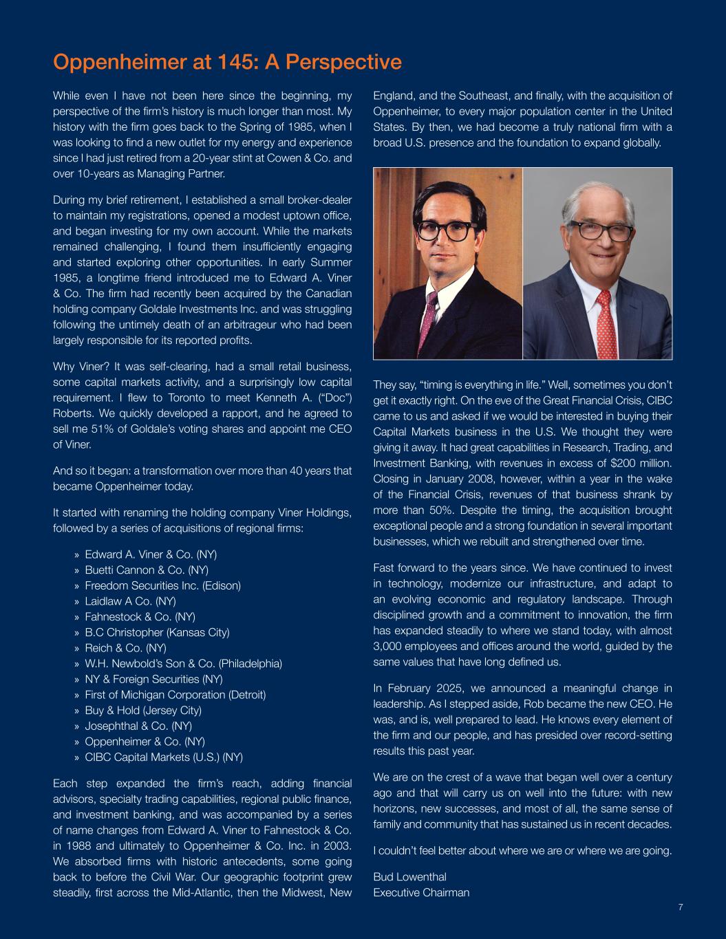 While even I have not been here since the beginning, my perspective of the firm’s history is much longer than most. My history with the firm goes back to the Spring of 1985, when I was looking to find a new outlet for my energy and experience since I had just retired from a 20-year stint at Cowen & Co. and over 10-years as Managing Partner. During my brief retirement, I established a small broker-dealer to maintain my registrations, opened a modest uptown office, and began investing for my own account. While the markets remained challenging, I found them insufficiently engaging and started exploring other opportunities. In early Summer 1985, a longtime friend introduced me to Edward A. Viner & Co. The firm had recently been acquired by the Canadian holding company Goldale Investments Inc. and was struggling following the untimely death of an arbitrageur who had been largely responsible for its reported profits. Why Viner? It was self-clearing, had a small retail business, some capital markets activity, and a surprisingly low capital requirement. I flew to Toronto to meet Kenneth A. (“Doc”) Roberts. We quickly developed a rapport, and he agreed to sell me 51% of Goldale’s voting shares and appoint me CEO of Viner. And so it began: a transformation over more than 40 years that became Oppenheimer today. It started with renaming the holding company Viner Holdings, followed by a series of acquisitions of regional firms: » Edward A. Viner & Co. (NY) » Buetti Cannon & Co. (NY) » Freedom Securities Inc. (Edison) » Laidlaw A Co. (NY) » Fahnestock & Co. (NY) » B.C Christopher (Kansas City) » Reich & Co. (NY) » W.H. Newbold’s Son & Co. (Philadelphia) » NY & Foreign Securities (NY) » First of Michigan Corporation (Detroit) » Buy & Hold (Jersey City) » Josephthal & Co. (NY) » Oppenheimer & Co. (NY) » CIBC Capital Markets (U.S.) (NY) Each step expanded the firm’s reach, adding financial advisors, specialty trading capabilities, regional public finance, and investment banking, and was accompanied by a series of name changes from Edward A. Viner to Fahnestock & Co. in 1988 and ultimately to Oppenheimer & Co. Inc. in 2003. We absorbed firms with historic antecedents, some going back to before the Civil War. Our geographic footprint grew steadily, first across the Mid-Atlantic, then the Midwest, New England, and the Southeast, and finally, with the acquisition of Oppenheimer, to every major population center in the United States. By then, we had become a truly national firm with a broad U.S. presence and the foundation to expand globally. They say, “timing is everything in life.” Well, sometimes you don’t get it exactly right. On the eve of the Great Financial Crisis, CIBC came to us and asked if we would be interested in buying their Capital Markets business in the U.S. We thought they were giving it away. It had great capabilities in Research, Trading, and Investment Banking, with revenues in excess of $200 million. Closing in January 2008, however, within a year in the wake of the Financial Crisis, revenues of that business shrank by more than 50%. Despite the timing, the acquisition brought exceptional people and a strong foundation in several important businesses, which we rebuilt and strengthened over time. Fast forward to the years since. We have continued to invest in technology, modernize our infrastructure, and adapt to an evolving economic and regulatory landscape. Through disciplined growth and a commitment to innovation, the firm has expanded steadily to where we stand today, with almost 3,000 employees and offices around the world, guided by the same values that have long defined us. In February 2025, we announced a meaningful change in leadership. As I stepped aside, Rob became the new CEO. He was, and is, well prepared to lead. He knows every element of the firm and our people, and has presided over record-setting results this past year. We are on the crest of a wave that began well over a century ago and that will carry us on well into the future: with new horizons, new successes, and most of all, the same sense of family and community that has sustained us in recent decades. I couldn’t feel better about where we are or where we are going. Bud Lowenthal Executive Chairman Oppenheimer at 145: A Perspective 7