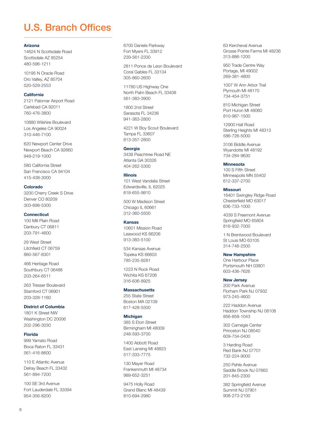 Arizona 14624 N Scottsdale Road Scottsdale AZ 85254 480-596-1211 10195 N Oracle Road Oro Valley, AZ 85704 520-529-2553 California 2121 Palomar Airport Road Carlsbad CA 92011 760-476-3800 10880 Wilshire Boulevard Los Angeles CA 90024 310-446-7100 620 Newport Center Drive Newport Beach CA 92660 949-219-1000 580 California Street San Francisco CA 94104 415-438-3000 Colorado 3200 Cherry Creek S Drive Denver CO 80209 303-698-5300 Connecticut 100 Mill Plain Road Danbury CT 06811 203-791-4600 29 West Street Litchfield CT 06759 860-567-8301 466 Heritage Road Southbury CT 06488 203-264-6511 263 Tresser Boulevard Stamford CT 06901 203-328-1160 District of Columbia 1801 K Street NW Washington DC 20006 202-296-3030 Florida 999 Yamato Road Boca Raton FL 33431 561-416-8600 110 E Atlantic Avenue Delray Beach FL 33432 561-894-7200 100 SE 3rd Avenue Fort Lauderdale FL 33394 954-356-8200 6700 Daniels Parkway Fort Myers FL 33912 239-561-2330 2811 Ponce de Leon Boulevard Coral Gables FL 33134 305-860-2600 11780 US Highway One North Palm Beach FL 33408 561-383-3900 1800 2nd Street Sarasota FL 34236 941-363-2800 4221 W Boy Scout Boulevard Tampa FL 33607 813-357-2800 Georgia 3438 Peachtree Road NE Atlanta GA 30326 404-262-5300 Illinois 101 West Vandalia Street Edwardsville, IL 62025 618-655-9810 500 W Madison Street Chicago IL 60661 312-360-5500 Kansas 10601 Mission Road Leawood KS 66206 913-383-5100 534 Kansas Avenue Topeka KS 66603 785-235-9281 1223 N Rock Road Wichita KS 67206 316-636-8925 Massachusetts 255 State Street Boston MA 02109 617-428-5500 Michigan 385 S Eton Street Birmingham MI 48009 248-593-3700 1400 Abbott Road East Lansing MI 48823 517-333-7775 130 Mayer Road Frankenmuth MI 48734 989-652-3251 9475 Holly Road Grand Blanc MI 48439 810-694-2980 63 Kercheval Avenue Grosse Pointe Farms MI 48236 313-886-1200 950 Trade Centre Way Portage, MI 49002 269-381-4800 1007 W Ann Arbor Trail Plymouth MI 48170 734-454-3751 810 Michigan Street Port Huron MI 48060 810-987-1500 12900 Hall Road Sterling Heights MI 48313 586-726-5000 3106 Biddle Avenue Wyandotte MI 48192 734-284-9630 Minnesota 100 S Fifth Street Minneapolis MN 55402 612-337-2700 Missouri 16401 Swingley Ridge Road Chesterfield MO 63017 636-733-1000 4039 S Freemont Avenue Springfield MO 65804 816-932-7000 1 N Brentwood Boulevard St Louis MO 63105 314-746-2500 New Hampshire One Harbour Place Portsmouth NH 03801 603-436-7626 New Jersey 200 Park Avenue Florham Park NJ 07932 973-245-4600 222 Haddon Avenue Haddon Township NJ 08108 856-858-1043 302 Carnegie Center Princeton NJ 08540 609-734-0400 3 Harding Road Red Bank NJ 07701 732-224-9000 250 Pehle Avenue Saddle Brook NJ 07663 201-845-2300 382 Springfield Avenue Summit NJ 07901 908-273-2100 U.S. Branch Offices 8