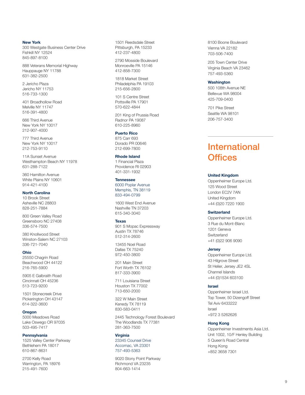 New York 300 Westgate Business Center Drive Fishkill NY 12524 845-897-8100 888 Veterans Memorial Highway Hauppauge NY 11788 631-382-2500 2 Jericho Plaza Jericho NY 11753 516-733-1300 401 Broadhollow Road Melville NY 11747 516-391-4800 666 Third Avenue New York NY 10017 212-907-4000 777 Third Avenue New York NY 10017 212-753-9110 11A Sunset Avenue Westhampton Beach NY 11978 631-288-7122 360 Hamilton Avenue White Plains NY 10601 914-421-4100 North Carolina 10 Brook Street Asheville NC 28803 828-251-7884 800 Green Valley Road Greensboro NC 27408 336-574-7500 380 Knollwood Street Winston-Salem NC 27103 336-721-7040 Ohio 25550 Chagrin Road Beachwood OH 44122 216-765-5900 5905 E Galbraith Road Cincinnati OH 45236 513-723-9200 1501 Stonecreek Drive Pickerington OH 43147 614-322-3600 Oregon 5000 Meadows Road Lake Oswego OR 97035 503-495-7417 Pennsylvania 1525 Valley Center Parkway Bethlehem PA 18017 610-867-8631 2700 Kelly Road Warrington, PA 18976 215-491-7600 1501 Reedsdale Street Pittsburgh, PA 15233 412-237-4800 2790 Mosside Boulevard Monroeville PA 15146 412-858-7300 1818 Market Street Philadelphia PA 19103 215-656-2800 101 S Centre Street Pottsville PA 17901 570-622-4844 201 King of Prussia Road Radnor PA 19087 610-225-8960 Puerto Rico 875 Carr 693 Dorado PR 00646 212-699-7800 Rhode Island 1 Financial Plaza Providence RI 02903 401-331-1932 Tennessee 6000 Poplar Avenue Memphis, TN 38119 833-494-0799 1600 West End Avenue Nashville TN 37203 615-340-3040 Texas 901 S Mopac Expressway Austin TX 78746 512-314-2600 13455 Noel Road Dallas TX 75240 972-450-3800 201 Main Street Fort Worth TX 76102 817-333-3900 711 Louisiana Street Houston TX 77002 713-650-2000 322 W Main Street Kenedy TX 78119 830-583-0411 2445 Technology Forest Boulevard The Woodlands TX 77381 281-363-7500 Virginia 23345 Counsel Drive Accomac, VA 23301 757-493-5363 9020 Stony Point Parkway Richmond VA 23235 804-663-1414 8100 Boone Boulevard Vienna VA 22182 703-506-7400 205 Town Center Drive Virginia Beach VA 23462 757-493-5360 Washington 500 108th Avenue NE Bellevue WA 98004 425-709-0400 701 Pike Street Seattle WA 98101 206-757-3400 International Offices United Kingdom Oppenheimer Europe Ltd. 125 Wood Street London EC2V 7AN United Kingdom +44 (0)20 7220 1900 Switzerland Oppenheimer Europe Ltd. 3 Rue du Mont-Blanc 1201 Geneva Switzerland +41 (0)22 906 9090 Jersey Oppenheimer Europe Ltd. 43 Hilgrove Street St Helier, Jersey JE2 4SL Channel Islands +44 (0)1534 603100 Israel Oppenheimer Israel Ltd. Top Tower, 50 Dizengoff Street Tel Aviv 6433222 Israel +972 3 5262626 Hong Kong Oppenheimer Investments Asia Ltd. Unit 1002, 10/F Henley Building 5 Queen’s Road Central Hong Kong +852 3658 7301 9