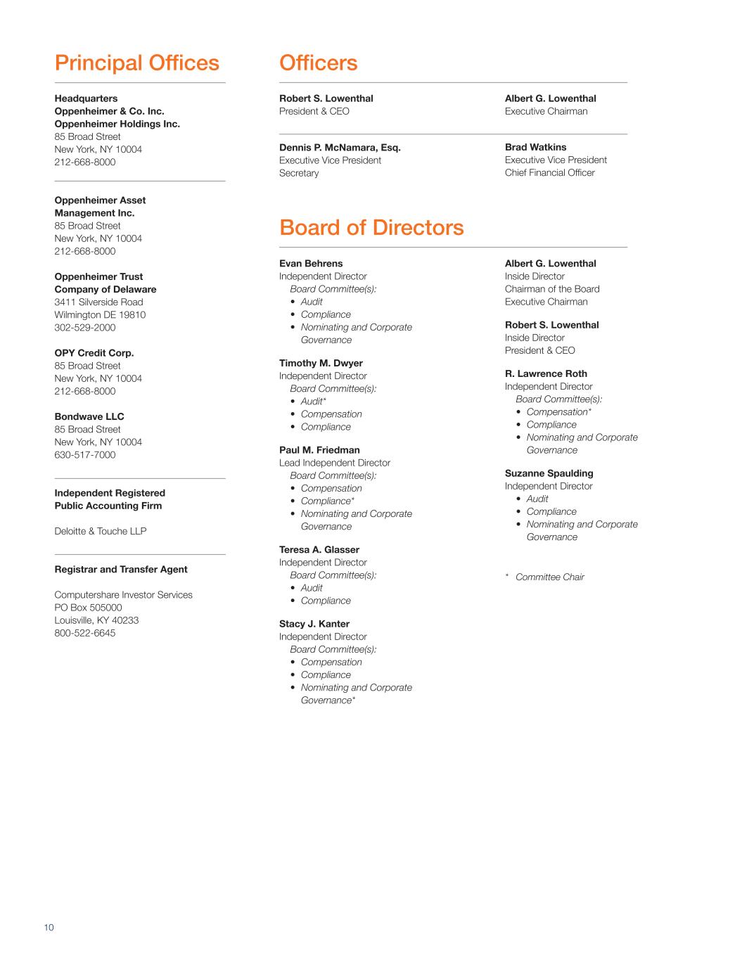 Headquarters Oppenheimer & Co. Inc. Oppenheimer Holdings Inc. 85 Broad Street New York, NY 10004 212-668-8000 Oppenheimer Asset Management Inc. 85 Broad Street New York, NY 10004 212-668-8000 Oppenheimer Trust Company of Delaware 3411 Silverside Road Wilmington DE 19810 302-529-2000 OPY Credit Corp. 85 Broad Street New York, NY 10004 212-668-8000 Bondwave LLC 85 Broad Street New York, NY 10004 630-517-7000 Independent Registered Public Accounting Firm Deloitte & Touche LLP Registrar and Transfer Agent Computershare Investor Services PO Box 505000 Louisville, KY 40233 800-522-6645 Evan Behrens Independent Director Board Committee(s): • Audit • Compliance • Nominating and Corporate Governance Timothy M. Dwyer Independent Director Board Committee(s): • Audit* • Compensation • Compliance Paul M. Friedman Lead Independent Director Board Committee(s): • Compensation • Compliance* • Nominating and Corporate Governance Teresa A. Glasser Independent Director Board Committee(s): • Audit • Compliance Stacy J. Kanter Independent Director Board Committee(s): • Compensation • Compliance • Nominating and Corporate Governance* Albert G. Lowenthal Inside Director Chairman of the Board Executive Chairman Robert S. Lowenthal Inside Director President & CEO R. Lawrence Roth Independent Director Board Committee(s): • Compensation* • Compliance • Nominating and Corporate Governance Suzanne Spaulding Independent Director • Audit • Compliance • Nominating and Corporate Governance * Committee Chair Robert S. Lowenthal President & CEO Dennis P. McNamara, Esq. Executive Vice President Secretary Albert G. Lowenthal Executive Chairman Brad Watkins Executive Vice President Chief Financial Officer Officers Board of Directors Principal Offices 10