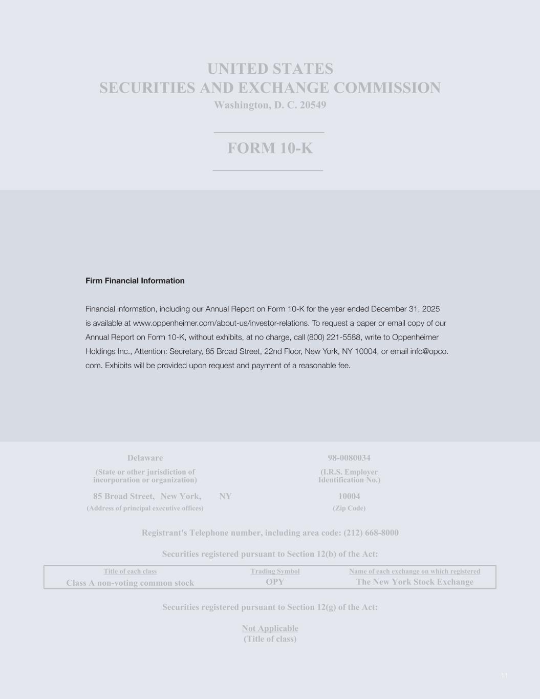 As filed with the U.S. Securities and Exchange Commission on February 28, 2022 UNITED STATES SECURITIES AND EXCHANGE COMMISSION Washington, D. C. 20549 FORM 10-K (Mark One) x ANNUAL REPORT PURSUANT TO SECTION 13 OR 15(d) OF THE SECURITIES EXCHANGE ACT OF 1934 For the fiscal year ended December 31, 2021 OR o TRANSITION REPORT PURSUANT TO SECTION 13 OR 15(d) OF THE SECURITIES EXCHANGE ACT OF 1934 For the transition period from to Commission file number 1-12043 OPPENHEIMER HOLDINGS INC. (Exact name of registrant as specified in its charter) Delaware 98-0080034 (State or other jurisdiction of incorporation or organization) (I.R.S. Employer Identification No.) 85 Broad Street, New York, NY 10004 (Address of principal executive offices) (Zip Code) Registrant's Telephone number, including area code: (212) 668-8000 Securities registered pursuant to Section 12(b) of the Act: Title of each class Trading Symbol Name of each exchange on which registered Class A non-voting common stock OPY The New York Stock Exchange Securities registered pursuant to Section 12(g) of the Act: Not Applicable (Title of class) Table of Contents Firm Financial Information Financial information, including our Annual Report on Form 10-K for the year ended December 31, 2025 is available at www.oppenheimer.com/about-us/investor-relations. To request a paper or email copy of our Annual Report on Form 10-K, without exhibits, at no charge, call (800) 221-5588, write to Oppenheimer Holdings Inc., Attention: Secretary, 85 Broad Street, 22nd Floor, New York, NY 10004, or email info@opco. com. Exhibits will be provided upon request and payment of a reasonable fee. 11