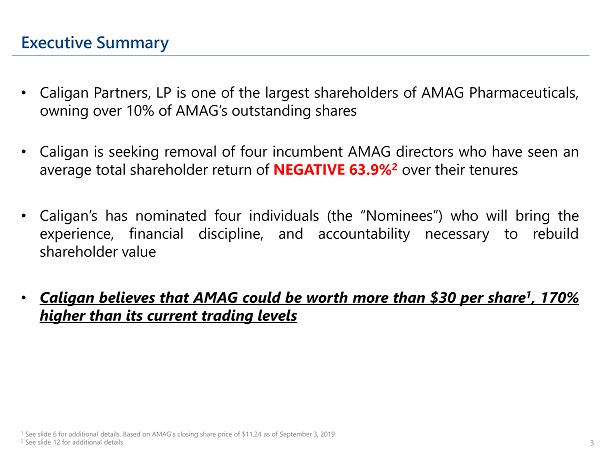 Additional Information 2 • THIS PRESENTATION AND THE VIEWS EXPRESSED HEREIN ARE ONLY TO BE USED TO PROVIDE GENERAL INFORMATION FROM CALIGAN PARTNERS LP AND ITS AFFILIATES (COLLECTIVELY, “CALIGAN”) REGARDING AMAG PHARMACEUTICALS, INC . (“AMAG” OR THE “COMPANY”) . THIS PRESENTATION AND THE VIEWS EXPRESSED HEREIN DO NOT HAVE REGARD TO THE SPECIFIC INVESTMENT OBJECTIVE, FINANCIAL SITUATION, SUITABILITY, OR THE PARTICULAR NEED OF ANY SPECIFIC PERSON WHO MAY RECEIVE THIS PRESENTATION, AND SHOULD NOT BE TAKEN AS ADVICE ON THE MERITS OF ANY INVESTMENT DECISION . THE VIEWS EXPRESSED HEREIN REPRESENT THE CURRENT OPINIONS AS OF THE DATE HEREOF OF CALIGAN AND ARE DERIVED FROM PUBLICLY AVAILABLE INFORMATION AND THE ANALYSIS OF CALIGAN REGARDING THE COMPANY . CERTAIN FINANCIAL INFORMATION AND DATA USED HEREIN HAVE BEEN DERIVED OR OBTAINED FROM, WITHOUT INDEPENDENT VERIFICATION, PUBLIC FILINGS, INCLUDING FILINGS MADE BY THE COMPANY WITH THE SECURITIES AND EXCHANGE COMMISSION (“SEC”), AND OTHER SOURCES . • THIS PRESENTATION DOES NOT CONSTITUTE AN OFFER TO SELL OR A SOLICITATION OF AN OFFER TO BUY ANY SECURITY DESCRIBED HEREIN IN ANY JURISDICTION TO ANY PERSON, NOR DOES IT CONSTITUTE A FINANCIAL PROMOTION, INVESTMENT ADVICE OR AN INDUCEMENT OR AN INCITEMENT TO PARTICIPATE IN ANY PRODUCT, OFFERING OR INVESTMENT . THIS PRESENTATION IS INFORMATIONAL ONLY AND SHOULD NOT BE USED AS THE BASIS FOR ANY INVESTMENT DECISION, NOR SHOULD IT BE RELIED UPON FOR LEGAL, ACCOUNTING OR TAX ADVICE OR INVESTMENT RECOMMENDATIONS OR FOR ANY OTHER PURPOSE . NO REPRESENTATION OR WARRANTY IS MADE THAT CALIGAN’S INVESTMENT PROCESSES OR INVESTMENT OBJECTIVES WILL OR ARE LIKELY TO BE ACHIEVED OR SUCCESSFUL OR THAT CALIGAN’S INVESTMENT WILL MAKE ANY PROFIT OR WILL NOT SUSTAIN LOSSES . PAST PERFORMANCE IS NOT INDICATIVE OF FUTURE RESULTS . • CALIGAN HAS NOT SOUGHT OR OBTAINED CONSENT FROM ANY THIRD PARTY TO USE ANY STATEMENTS OR INFORMATION INDICATED HEREIN AS HAVING BEEN OBTAINED OR DERIVED FROM STATEMENTS MADE OR PUBLISHED BY THIRD PARTIES . ANY SUCH STATEMENTS OR INFORMATION SHOULD NOT BE VIEWED AS INDICATING THE SUPPORT OF SUCH THIRD PARTY FOR THE VIEWS EXPRESSED HEREIN . NO WARRANTY IS MADE THAT DATA OR INFORMATION, WHETHER DERIVED OR OBTAINED FROM FILINGS MADE WITH THE SEC OR FROM ANY THIRD PARTY, ARE ACCURATE . • EXCEPT FOR THE HISTORICAL INFORMATION CONTAINED HEREIN, THE MATTERS ADDRESSED IN THIS PRESENTATION, INCLUDING PROJECTIONS, MARKET OUTLOOKS, ASSUMPTIONS AND ESTIMATES, ARE FORWARD - LOOKING STATEMENTS THAT ARE BASED ON CERTAIN ASSUMPTIONS, AND INVOLVE CERTAIN RISKS AND UNCERTAINTIES, INCLUDING RISKS AND CHANGES AFFECTING INDUSTRIES GENERALLY AND THE COMPANY SPECIFICALLY . YOU SHOULD BE AWARE THAT PROJECTIONS AND OTHER FORWARD - LOOKING STATEMENTS ARE INHERENTLY UNCERTAIN, AND ACTUAL RESULTS MAY DIFFER FROM THE PROJECTIONS AND OTHER FORWARD LOOKING STATEMENTS CONTAINED HEREIN DUE TO REASONS THAT MAY OR MAY NOT BE FORESEEABLE . NO REPRESENTATION, WARRANTY OR UNDERTAKING, EXPRESS OR IMPLIED, IS MADE AS TO THE ACCURACY OR REASONABLENESS OF THE ASSUMPTIONS UNDERLYING THE PROJECTIONS AND OTHER FORWARD LOOKING STATEMENTS CONTAINED HEREIN OR TO THE ACCURACY OR COMPLETENESS OF THE INFORMATION OR VIEWS CONTAINED HEREIN . • CALIGAN SHALL NOT BE RESPONSIBLE OR HAVE ANY LIABILITY FOR ANY MISINFORMATION CONTAINED IN ANY SEC FILING, ANY THIRD PARTY REPORT OR THIS PRESENTATION . ALL AMOUNTS, MARKET VALUE INFORMATION AND ESTIMATES INCLUDED IN THIS PRESENTATION HAVE BEEN OBTAINED FROM OUTSIDE SOURCES THAT CALIGAN BELIEVES TO BE RELIABLE OR REPRESENT THE BEST JUDGMENT OF CALIGAN AS OF THE DATE OF THIS PRESENTATION . • CALIGAN RESERVES THE RIGHT TO CHANGE OR MODIFY ANY OF ITS OPINIONS EXPRESSED HEREIN AT ANY TIME AS IT DEEMS APPROPRIATE . CALIGAN DISCLAIMS ANY OBLIGATION TO UPDATE THE INFORMATION CONTAINED HEREIN .