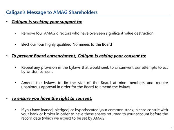 In addition, Caligan filed a Schedule 13D/A containing additional information regarding Caligan’s intention to solicit the consents of stockholders of AMAG, the relevant text of which is attached herewith as Exhibit 4.