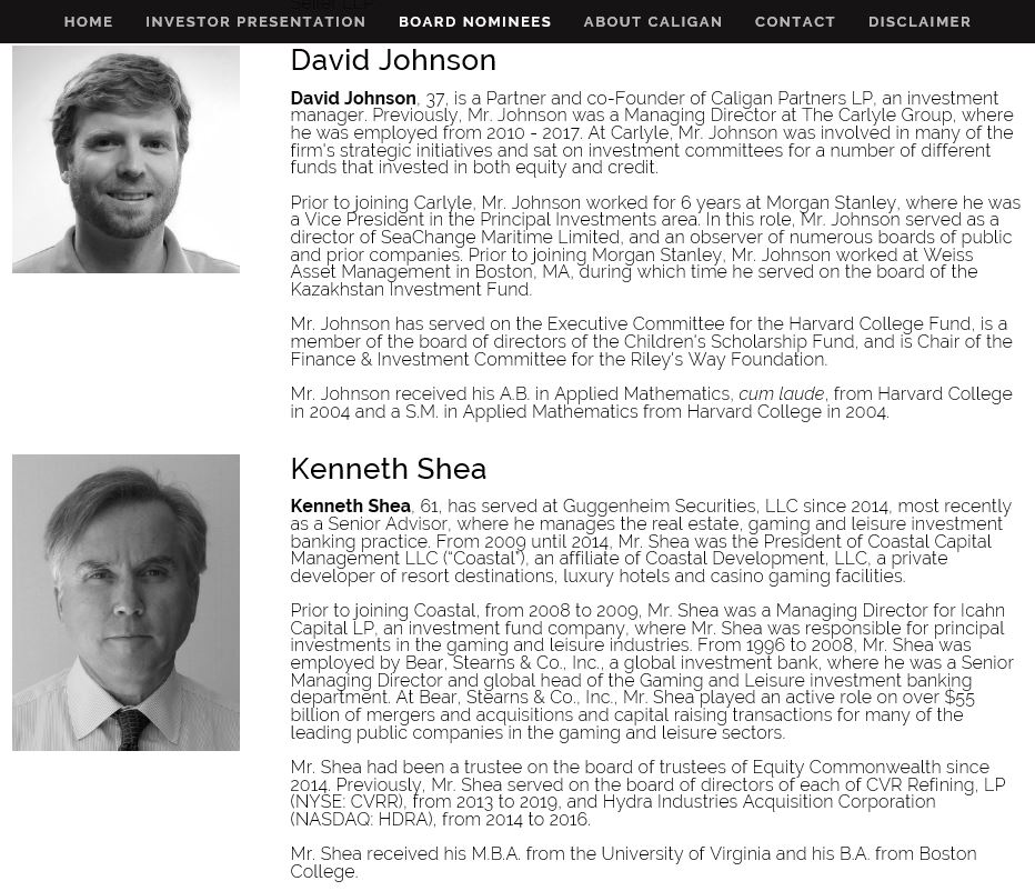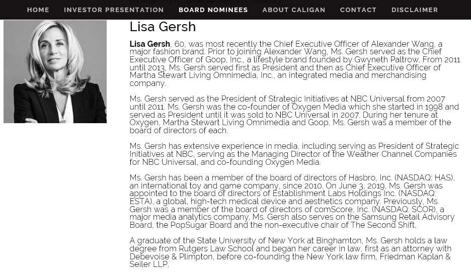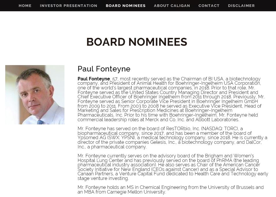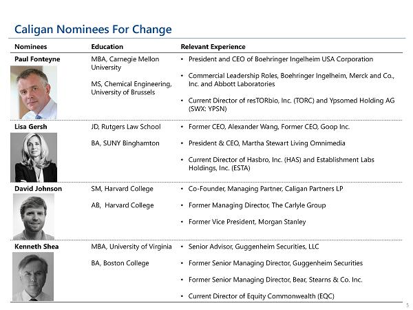 Caligan Nominees For Change 5 Nominees Education Relevant Experience Paul Fonteyne MBA, Carnegie Mellon University MS, Chemical Engineering, University of Brussels • President and CEO of Boehringer Ingelheim USA Corporation • Commercial Leadership Roles, Boehringer Ingelheim, Merck and Co., Inc. and Abbott Laboratories • Current Director of resTORbio , Inc. (TORC) and Ypsomed Holding AG (SWX: YPSN) Lisa Gersh JD, Rutgers Law School BA, SUNY Binghamton • Former CEO, Alexander Wang, Former CEO, Goop Inc. • President & CEO, Martha Stewart Living Omnimedia • Current Director of Hasbro, Inc. (HAS) and Establishment Labs Holdings, Inc. (ESTA) David Johnson SM, Harvard College AB, Harvard College • Co - Founder, Managing Partner, Caligan Partners LP • Former Managing Director, The Carlyle Group • Former Vice President, Morgan Stanley Kenneth Shea MBA, University of Virginia BA, Boston College • Senior Advisor, Guggenheim Securities, LLC • Former Senior Managing Director, Guggenheim Securities • Former Senior Managing Director, Bear, Stearns & Co. Inc. • Current Director of Equity Commonwealth (EQC)