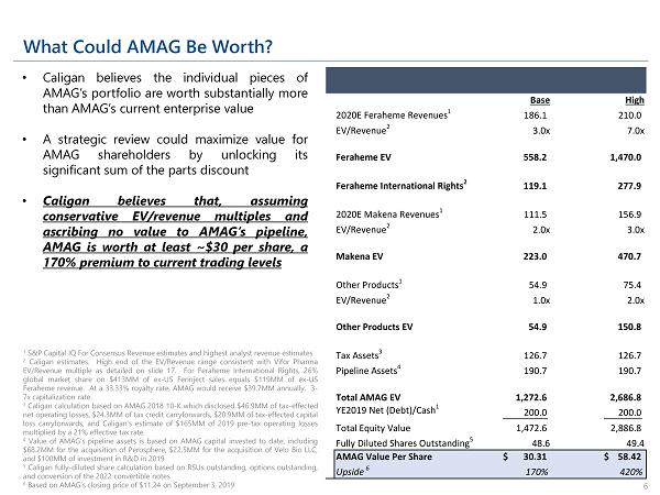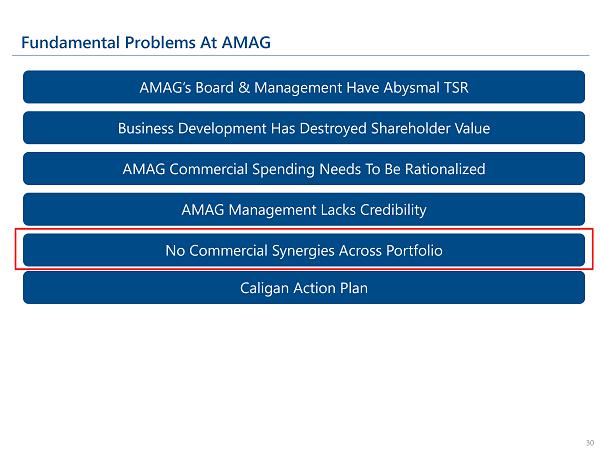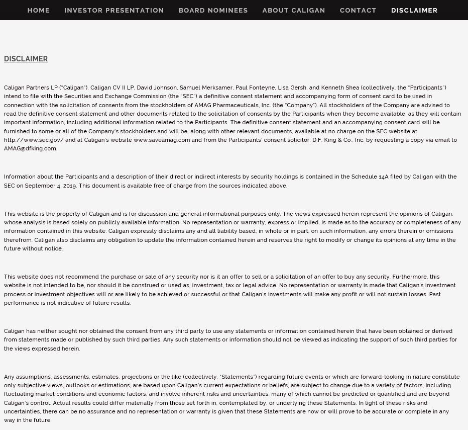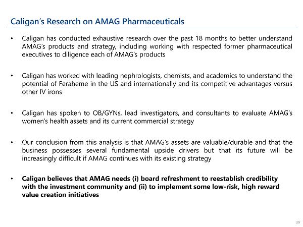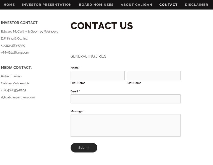 Additional information on each of the nominees is available at www.saveamag.com. Caligan has released presentation materials highlighting the operational, strategic, and capital allocation missteps that have resulted in over $1.3 billion of value destruction overseen by AMAG’s incumbent board and management. The materials note that while Caligan believes AMAG has unique, durable assets that could be worth at least $30 per share, AMAG’s current leadership will be unable to achieve that outcome for shareholders. The presentation can be accessed here.