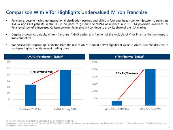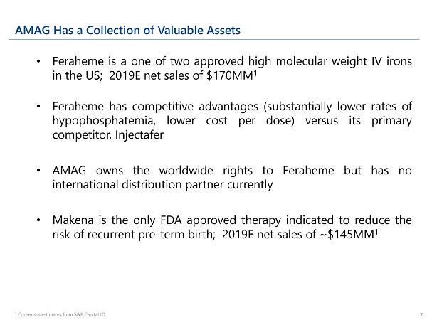 What Could AMAG Be Worth? 6 1 S&P Capital IQ For Consensus Revenue estimates and highest analyst revenue estimates 2 Caligan estimates . High end of the EV/Revenue range consistent with Vifor Pharma EV/Revenue multiple as detailed on slide 17 . For Feraheme International Rights, 26 % global market share on $ 413 MM of ex - US Ferinject sales equals $ 119 MM of ex - US Feraheme revenue . At a 33 . 33 % royalty rate, AMAG would receive $ 39 . 7 MM annually . 3 - 7 x capitalization rate . 3 Caligan calculation based on AMAG 2018 10 - K which disclosed $ 46 . 9 MM of tax - effected net operating losses, $ 24 . 3 MM of tax credit carryforwards, $ 20 . 9 MM of tax - effected capital loss carryforwards, and Caligan’s estimate of $ 165 MM of 2019 pre - tax operating losses multiplied by a 21 % effective tax rate 4 Value of AMAG’s pipeline assets is based on AMAG capital invested to date, including $ 68 . 2 MM for the acquisition of Perosphere , $ 22 . 5 MM for the acquisition of Velo Bio LLC, and $ 100 MM of investment in R&D in 2019 5 Caligan fully - diluted share calculation based on RSUs outstanding, options outstanding, and conversion of the 2022 convertible notes 6 Based on AMAG’s closing price of $ 11 . 24 on September 3 , 2019 • Caligan believes the individual pieces of AMAG’s portfolio are worth substantially more than AMAG’s current enterprise value • A strategic review could maximize value for AMAG shareholders by unlocking its significant sum of the parts discount • Caligan believes that, assuming conservative EV/revenue multiples and ascribing no value to AMAG’s pipeline, AMAG is worth at least ~ $ 30 per share, a 170 % premium to current trading levels Base High 2020E Feraheme Revenues 1 186.1 210.0 EV/Revenue 2 3.0x 7.0x Feraheme EV 558.2 1,470.0 Feraheme International Rights 2 119.1 277.9 2020E Makena Revenues 1 111.5 156.9 EV/Revenue 2 2.0x 3.0x Makena EV 223.0 470.7 Other Products 1 54.9 75.4 EV/Revenue 2 1.0x 2.0x Other Products EV 54.9 150.8 Tax Assets 3 126.7 126.7 Pipeline Assets 4 190.7 190.7 Total AMAG EV 1,272.6 2,686.8 YE2019 Net (Debt)/Cash 1 200.0 200.0 Total Equity Value 1,472.6 2,886.8 Fully Diluted Shares Outstanding 5 48.6 49.4 AMAG Value Per Share 30.31$ 58.42$ Upside 6 170% 420%