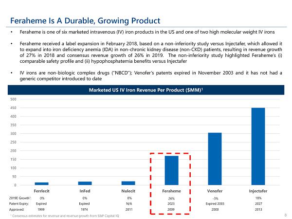 AMAG Has a Collection of Valuable Assets 7 • Feraheme is a one of two approved high molecular weight IV irons in the US ; 2019 E net sales of $ 170 MM 1 • Feraheme has competitive advantages (substantially lower rates of hypophosphatemia, lower cost per dose) versus its primary competitor, Injectafer • AMAG owns the worldwide rights to Feraheme but has no international distribution partner currently • Makena is the only FDA approved therapy indicated to reduce the risk of recurrent pre - term birth ; 2019 E net sales of ~ $ 145 MM 1 1 Consensus estimates from S&P Capital IQ.