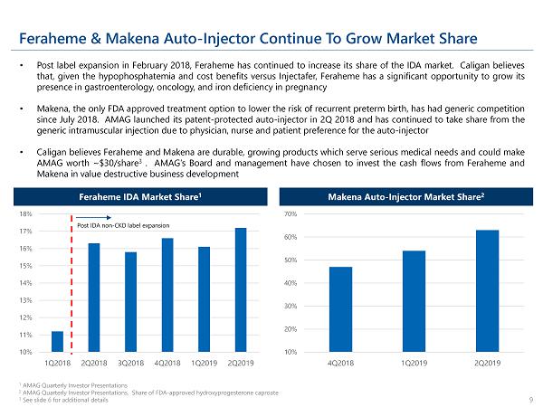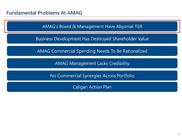 Feraheme & Makena Auto - Injector Continue To Grow Market Share 9 • Post label expansion in February 2018 , Feraheme has continued to increase its share of the IDA market . Caligan believes that, given the hypophosphatemia and cost benefits versus Injectafer , Feraheme has a significant opportunity to grow its presence in gastroenterology, oncology, and iron deficiency in pregnancy • Makena, the only FDA approved treatment option to lower the risk of recurrent preterm birth, has had generic competition since July 2018 . AMAG launched its patent - protected auto - injector in 2 Q 2018 and has continued to take share from the generic intramuscular injection due to physician, nurse and patient preference for the auto - injector • Caligan believes Feraheme and Makena are durable, growing products which serve serious medical needs and could make AMAG worth ~ $ 30 /share 3 . AMAG’s Board and management have chosen to invest the cash flows from Feraheme and Makena in value destructive business development Feraheme IDA Market Share 1 Makena Auto - Injector Market Share 2 1 AMAG Quarterly Investor Presentations 2 AMAG Quarterly Investor Presentations. Share of FDA - approved hydroxyprogesterone caproate 3 See slide 6 for additional details 10% 11% 12% 13% 14% 15% 16% 17% 18% 1Q2018 2Q2018 3Q2018 4Q2018 1Q2019 2Q2019 Post IDA non - CKD label expansion 10% 20% 30% 40% 50% 60% 70% 4Q2018 1Q2019 2Q2019