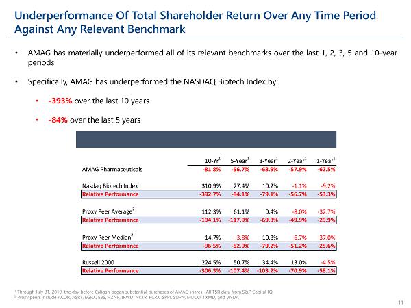 Fundamental Problems At AMAG 10 AMAG’s Board & Management Have Abysmal TSR AMAG Commercial Spending Needs To Be Rationalized Business Development Has Destroyed Shareholder Value AMAG Management Lacks Credibility No Commercial Synergies Across Portfolio Caligan Action Plan