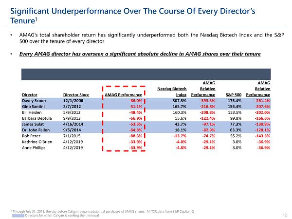Underperformance Of Total Shareholder Return Over Any Time Period Against Any Relevant Benchmark 11 • AMAG has materially underperformed all of its relevant benchmarks over the last 1 , 2 , 3 , 5 and 10 - year periods • Specifically, AMAG has underperformed the NASDAQ Biotech Index by : • - 393 % over the last 10 years • - 84 % over the last 5 years 1 Through July 31, 2019, the day before Caligan began substantial purchases of AMAG shares. All TSR data from S&P Capital IQ 2 Proxy peers include ACOR, ASRT, EGRX, EBS, HZNP, IRWD, NKTR, PCRX, SPPI, SUPN, MDCO, TXMD, and VNDA 10-Yr 1 5-Year 1 3-Year 1 2-Year 1 1-Year 1 AMAG Pharmaceuticals -81.8% -56.7% -68.9% -57.9% -62.5% Nasdaq Biotech Index 310.9% 27.4% 10.2% -1.1% -9.2% Relative Performance -392.7% -84.1% -79.1% -56.7% -53.3% Proxy Peer Average 2 112.3% 61.1% 0.4% -8.0% -32.7% Relative Performance -194.1% -117.9% -69.3% -49.9% -29.9% Proxy Peer Median 2 14.7% -3.8% 10.3% -6.7% -37.0% Relative Performance -96.5% -52.9% -79.2% -51.2% -25.6% Russell 2000 224.5% 50.7% 34.4% 13.0% -4.5% Relative Performance -306.3% -107.4% -103.2% -70.9% -58.1%
