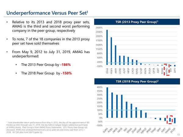 Significant Underperformance Over The Course Of Every Director’s Tenure 1 12 • AMAG’s total shareholder return has significantly underperformed both the Nasdaq Biotech Index and the S&P 500 over the tenure of every director • Every AMAG director has overseen a significant absolute decline in AMAG shares over their tenure 1 Through July 31, 2019, the day before Caligan began substantial purchases of AMAG shares. All TSR data from S&P Capital IQ Directors for which Caligan is seeking their removal Director Director Since AMAG Performance Nasdaq Biotech Index AMAG Relative Performance S&P 500 AMAG Relative Performance Davey Scoon 12/1/2006 -86.0% 307.3% -393.3% 175.4% -261.4% Gino Santini 2/7/2012 -51.1% 165.7% -216.8% 156.4% -207.6% Bill Heiden 5/9/2012 -48.4% 160.3% -208.8% 153.5% -202.0% Barbara Deptula 9/9/2013 -66.9% 55.6% -122.4% 99.8% -166.6% James Sulat 4/16/2014 -53.5% 43.7% -97.1% 77.3% -130.8% Dr. John Fallon 9/5/2014 -64.8% 18.1% -82.9% 63.3% -128.1% Rob Perez 7/1/2015 -88.3% -13.7% -74.7% 55.2% -143.5% Kathrine O'Brien 4/12/2019 -33.9% -4.8% -29.1% 3.0% -36.9% Anne Phillips 4/12/2019 -33.9% -4.8% -29.1% 3.0% -36.9%