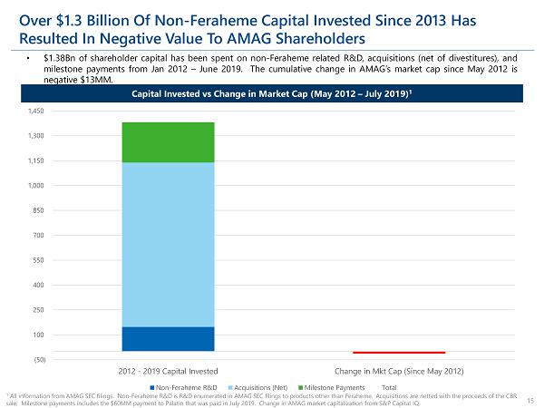 Fundamental Problems At AMAG 14 AMAG’s Board & Management Have Abysmal TSR AMAG Commercial Spending Needs To Be Rationalized Business Development Has Destroyed Shareholder Value AMAG Management Lacks Credibility No Commercial Synergies Across Portfolio Caligan Action Plan