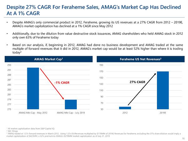 Over $1.3 Billion Of Non - Feraheme Capital Invested Since 2013 Has Resulted In Negative Value To AMAG Shareholders 15 • $ 1 . 38 Bn of shareholder capital has been spent on non - Feraheme related R&D, acquisitions (net of divestitures), and milestone payments from Jan 2012 – June 2019 . The cumulative change in AMAG’s market cap since May 2012 is negative $ 13 MM . 1 All information from AMAG SEC filings. Non - Feraheme R&D is R&D enumerated in AMAG SEC filings to products other than Feraheme. Acquisitions are netted with the proceeds of the CBR sale. Milestone payments includes the $60MM payment to Palatin that was paid in July 2019. Change in AMAG market capitaliza tio n from S&P Capital IQ. Capital Invested vs Change in Market Cap (May 2012 – July 2019) 1 (50) 100 250 400 550 700 850 1,000 1,150 1,300 1,450 2012 - 2019 Capital Invested Change in Mkt Cap (Since May 2012) Non-Feraheme R&D Acquisitions (Net) Milestone Payments Total