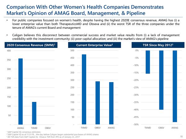 - 2,000 4,000 6,000 8,000 10,000 12,000 Vifor IV Iron 2019E Rev Vifor EV - July 2019 - 50 100 150 200 250 300 350 Feraheme 2019E Rev AMAG EV - July 2019 Comparison With Vifor Highlights Undervalued IV Iron Franchise 17 • Feraheme, despite having no international distribution partner, and giving a four year head start to Injectafer to penetrate IDA in non - CKD patients in the US, is on pace to generate $ 170 MM of revenue in 2019 . As physician awareness of Feraheme’s benefits increases, Caligan believes Feraheme will continue to grow its share of the IDA market • Despite a growing, durable, IV iron franchise, AMAG trades at a fraction of the multiple of Vifor Pharma, the dominant IV iron competitor • We believe that separating Feraheme from the rest of AMAG should deliver significant value to AMAG shareholders that is multiples higher than its current trading price 1 Consensus Feraheme estimates from S&P Capital IQ. EV from S&P Capital IQ 2 Consensus IV iron estimates from S&P Capital IQ. EV from S&P Capital IQ. Vifor IV Iron revenue incorporates the full amount o f Regent’s US sales. Vifor reports 33.3% of the total revenue for Regent’s sales and bears no costs. AMAG ( Feraheme ) ($MM) 1 Vifor Pharma ($MM) 2 1.7x EV/Revenue 7.5x EV/Revenue