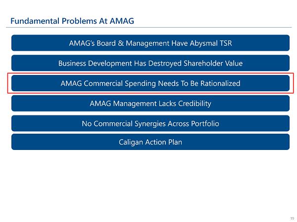 • For public companies focused on women’s health, despite having the highest 2020 E consensus revenue, AMAG has (i) a lower enterprise value than both TherapeuticsMD and Obseva and (ii) the worst TSR of the three companies under the tenure of AMAG’s current Board and management • Caligan believes this disconnect between commercial success and market value results from (i) a lack of management credibility with the investment community ; (ii) poor capital allocation ; and (iii) the market’s view of AMAG’s pipeline Comparison With Other Women’s Health Companies Demonstrates Market’s Opinion of AMAG Board, Management, & Pipeline 18 1 S&P Capital IQ consensus estimates 2 S&P Capital IQ as of 7 / 31 / 19 , , the day before Caligan began substantial purchases of AMAG shares 3 All TSR data from S&P Capital IQ . Obseva TSR from IPO as of January 25 , 2017 2020 Consensus Revenue ($MM) 1 Current Enterprise Value 2 TSR Since May 2012 3 - 50 100 150 200 250 300 350 400 AMAG TXMD OBSV - 50 100 150 200 250 300 350 400 450 500 TXMD OBSV AMAG -50% -45% -40% -35% -30% -25% -20% -15% -10% -5% 0% TXMD OBSV AMAG