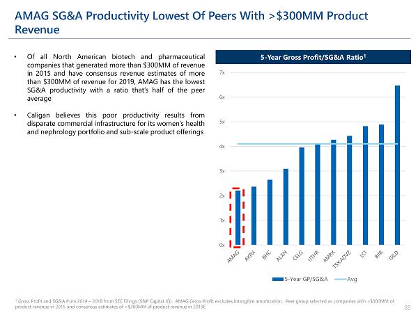 • The synergies that AMAG highlighted when pursuing the Lumara and CBR acquisitions have never materialized : • When announcing the Lumara acquisition in September 2014 , AMAG highlighted revenues of $ 180 MM and EBITDA of $ 110 MM and synergies of $ 20 MM . Combined with Feraheme this would imply an operating expense run - rate of $ 101 MM . Actual 2015 operating expense of $ 131 MM missed by over $ 30 MM • Then, in 2015 , in announcing the purchase of CBR, AMAG highlighted $ 60 MM of EBITDA from CBR, which included $ 15 MM of synergies . Combined with Feraheme and Makena, this implied an operating expense run - rate of $ 145 MM . Actual 2016 operating expense of $ 193 MM missed by over $ 47 MM Announced Merger Synergies Never Materialized 21 1 Feraheme 2014 SG&A is from AMAG”s 10 - Q annualized . Makena operating expenses are calculated as $ 180 MM of revenue at an assumed 95 % gross margin less $ 110 MM of EBITDA . Synergies are from AMAG’s investor presentation announcing the acquisition . 2015 Actual is from AMAG’s 2018 10 - K 2 Feraheme 2014 SG&A is from AMAG”s 10 - Q annualized . Makena operating expenses are calculated as $ 180 MM of revenue at an assumed 95 % gross margin less $ 110 MM of EBITDA . Synergies are from AMAG’s investor presentation announcing the acquisition . CBR operating expenses are using AMAG”s projections from the CBR acquisition announcement which assumed $ 120 MM of revenue, at a 95 % gross margin, less $ 60 MM of EBITDA . 2016 Actual operating expenses are from AMAG’s 2016 10 - K Feraheme + Makena Opex ($MM) 1 Feraheme, Makena + CBR Opex ($MM) 2 $30MM Miss $47MM Miss
