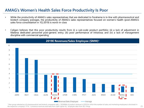 AMAG SG&A Productivity Lowest Of Peers With >$300MM Product Revenue 22 1 Gross Profit and SG&A from 2014 – 2018 from SEC Filings (S&P Capital IQ). AMAG Gross Profit excludes intangible amortization. Peer group selected as companies with >$300MM of product revenue in 2015 and consensus estimates of >$300MM of product revenue in 2019E 5 - Year Gross Profit/SG&A Ratio 1 • Of all North American biotech and pharmaceutical companies that generated more than $ 300 MM of revenue in 2015 and have consensus revenue estimates of more than $ 300 MM of revenue for 2019 , AMAG has the lowest SG&A productivity with a ratio that’s half of the peer average • Caligan believes this poor productivity results from disparate commercial infrastructure for its women’s health and nephrology portfolio and sub - scale product offerings 0x 1x 2x 3x 4x 5x 6x 7x 5-Year GP/SG&A Avg