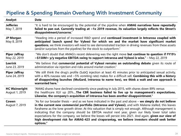 Pipeline & Spending Remain Overhang With Investment Community 24 Analyst Date Jefferies May 7 , 2019 “It is hard to be encouraged by the potential of the pipeline when AMAG narratives have repeatedly failed to pan out . Currently trading at ~ 1 x 2019 revenue, its valuation largely reflects the Street's disappointment/concerns . ” JP Morgan May 8 , 2019 “Heading into a period of increased R&D spend and continued investment in Intrarosa coupled with anticipated launch spend for Vyleesi for which we and the market have significant market questions , we think investors will need to see demonstrated traction in driving revenues from these assets (and/or surprises from the pipeline) for the stock to outperform . ” Piper Jaffray May 22 , 2019 “We don’t doubt that AMAG’s recent delevering was the right move but continue to question if FY 19 's ~ $ 150 M+ y/y negative EBITDA swing to support Intrarosa and Vyleesi is wise . ” – May 22 , 2019 Leerink June 23 , 2019 “We believe that commercial potential of Vylessi remains an outstanding debate given its route of administration via injection and risks around market creation . ” Piper Jaffray June 24 , 2019 “We still think the drug’s profile ( SubQ injection at least 45 minutes prior to anticipated sexual activity, with a 40 % nausea rate and ~ 5 % vomiting rate) makes for a difficult sell . Combining this with a history of disappointing launches ( MuGard , Intrarosa to name two), we think a wait and see approach is warranted here . ” HC Wainwright August 1 , 2019 “AMAG shares have declined consistently since peaking in July 2015 , with shares down 89 % versus the healthcare XLV up 20 % .... The CBR business failed to live up to management’s expectations . Likewise, the company’s acquisition of Intrarosa has been another disappointment . ” Cowen August 7 , 2019 “ As for our broader thesis – and as we have indicated in the past and above – we simply do not believe in the current new commercial portfolio (Intrarosa and Vyleesi) , and with Makena stalled, this leaves Faraheme as the lone growth driver . At this valuation that is simply not enough . Although management is indicating that the company should be EBITDA neutral next year, given our likely lower total sales expectations for the company, we believe the losses will persist into 2021 . And again, given our view of high development risk for AMAG - 423 and ciraparantag, we believe investors should seek better options . ” Source: Analyst reports. Permission to use quotations neither sought nor obtained.