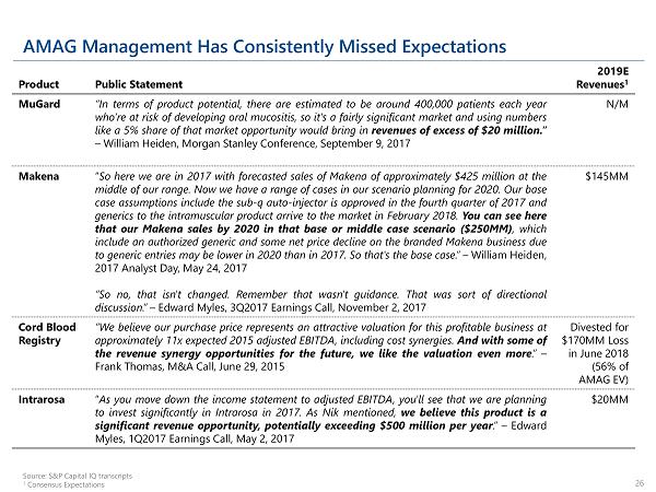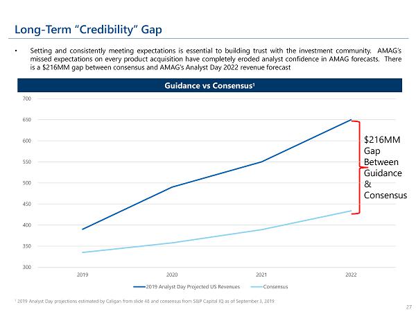 AMAG Management Has Consistently Missed Expectations 26 Product Public Statement 2019E Revenues 1 MuGard “In terms of product potential, there are estimated to be around 400 , 000 patients each year who’re at risk of developing oral mucositis, so it's a fairly significant market and using numbers like a 5 % share of that market opportunity would bring in revenues of excess of $ 20 million . ” – William Heiden, Morgan Stanley Conference, September 9 , 2017 N/M Makena “ So here we are in 2017 with forecasted sales of Makena of approximately $ 425 million at the middle of our range . Now we have a range of cases in our scenario planning for 2020 . Our base case assumptions include the sub - q auto - injector is approved in the fourth quarter of 2017 and generics to the intramuscular product arrive to the market in February 2018 . You can see here that our Makena sales by 2020 in that base or middle case scenario ( $ 250 MM) , which include an authorized generic and some net price decline on the branded Makena business due to generic entries may be lower in 2020 than in 2017 . So that's the base case . ” – William Heiden, 2017 Analyst Day, May 24 , 2017 “So no, that isn't changed . Remember that wasn't guidance . That was sort of directional discussion . ” – Edward Myles, 3 Q 2017 Earnings Call, November 2 , 2017 $145MM Cord Blood Registry “We believe our purchase price represents an attractive valuation for this profitable business at approximately 11 x expected 2015 adjusted EBITDA, including cost synergies . And with some of the revenue synergy opportunities for the future, we like the valuation even more . ” – Frank Thomas, M&A Call, June 29 , 2015 Divested for $170MM Loss in June 2018 (56% of AMAG EV) Intrarosa “ As you move down the income statement to adjusted EBITDA, you'll see that we are planning to invest significantly in Intrarosa in 2017 . As Nik mentioned, we believe this product is a significant revenue opportunity, potentially exceeding $ 500 million per year . ” – Edward Myles, 1 Q 2017 Earnings Call, May 2 , 2017 $20MM Source: S&P Capital IQ transcripts 1 Consensus Expectations