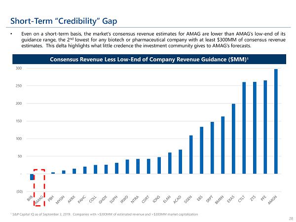 Long - Term “Credibility” Gap • Setting and consistently meeting expectations is essential to building trust with the investment community . AMAG’s missed expectations on every product acquisition have completely eroded analyst confidence in AMAG forecasts . There is a $ 216 MM gap between consensus and AMAG’s Analyst Day 2022 revenue forecast 1 2019 Analyst Day projections estimated by Caligan from slide 48 and consensus from S&P Capital IQ as of September 3, 2019 27 Guidance vs Consensus 1 300 350 400 450 500 550 600 650 700 2019 2020 2021 2022 2019 Analyst Day Projected US Revenues Consensus $216MM Gap Between Guidance & Consensus