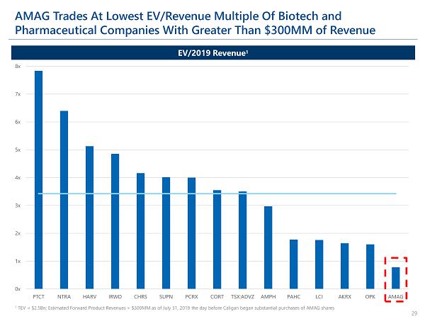0x 1x 2x 3x 4x 5x 6x 7x 8x PTCT NTRA HARV IRWD CHRS SUPN PCRX CORT TSX:ADVZ AMPH PAHC LCI AKRX OPK AMAG AMAG Trades At Lowest EV/Revenue Multiple Of Biotech and Pharmaceutical Companies With Greater Than $300MM of Revenue 29 1 TEV < $2.5Bn; Estimated Forward Product Revenues > $300MM as of July 31, 2019 the day before Caligan began substantial purcha se s of AMAG shares EV/2019 Revenue 1