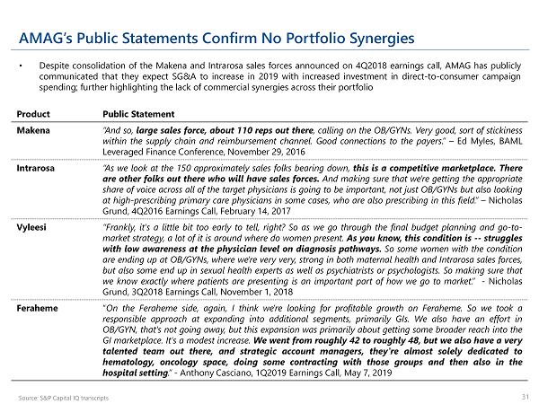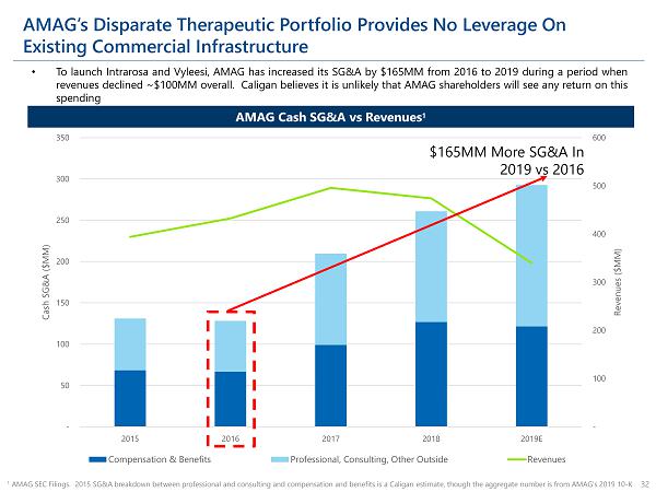 AMAG’s Public Statements Confirm No Portfolio Synergies 31 Product Public Statement Makena “And so, large sales force, about 110 reps out there , calling on the OB/GYNs . Very good, sort of stickiness within the supply chain and reimbursement channel . Good connections to the payers . ” – Ed Myles, BAML Leveraged Finance Conference, November 29 , 2016 Intrarosa “As we look at the 150 approximately sales folks bearing down, this is a competitive marketplace . There are other folks out there who will have sales forces . And making sure that we're getting the appropriate share of voice across all of the target physicians is going to be important, not just OB/GYNs but also looking at high - prescribing primary care physicians in some cases, who are also prescribing in this field . ” – Nicholas Grund, 4 Q 2016 Earnings Call, February 14 , 2017 Vyleesi “Frankly, it's a little bit too early to tell, right? So as we go through the final budget planning and go - to - market strategy, a lot of it is around where do women present . As you know, this condition is -- struggles with low awareness at the physician level on diagnosis pathways . So some women with the condition are ending up at OB/GYNs, where we're very very, strong in both maternal health and Intrarosa sales forces, but also some end up in sexual health experts as well as psychiatrists or psychologists . So making sure that we know exactly where patients are presenting is an important part of how we go to market . ” - Nicholas Grund, 3 Q 2018 Earnings Call, November 1 , 2018 Feraheme “ On the Feraheme side, again, I think we're looking for profitable growth on Feraheme . So we took a responsible approach at expanding into additional segments, primarily GIs . We also have an effort in OB/GYN, that's not going away, but this expansion was primarily about getting some broader reach into the GI marketplace . It's a modest increase . We went from roughly 42 to roughly 48 , but we also have a very talented team out there, and strategic account managers, they're almost solely dedicated to hematology, oncology space, doing some contracting with those groups and then also in the hospital setting . ” - Anthony Casciano, 1 Q 2019 Earnings Call, May 7 , 2019 Source: S&P Capital IQ transcripts • Despite consolidation of the Makena and Intrarosa sales forces announced on 4 Q 2018 earnings call, AMAG has publicly communicated that they expect SG&A to increase in 2019 with increased investment in direct - to - consumer campaign spending ; further highlighting the lack of commercial synergies across their portfolio