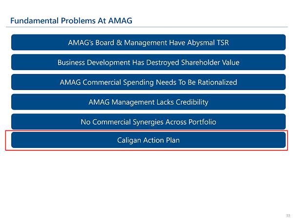 Fundamental Problems At AMAG 30 AMAG’s Board & Management Have Abysmal TSR AMAG Commercial Spending Needs To Be Rationalized Business Development Has Destroyed Shareholder Value AMAG Management Lacks Credibility No Commercial Synergies Across Portfolio Caligan Action Plan