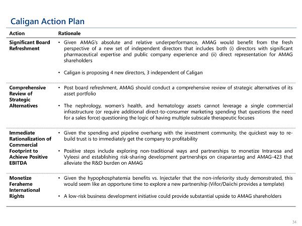 Fundamental Problems At AMAG 33 AMAG’s Board & Management Have Abysmal TSR AMAG Commercial Spending Needs To Be Rationalized Business Development Has Destroyed Shareholder Value AMAG Management Lacks Credibility No Commercial Synergies Across Portfolio Caligan Action Plan