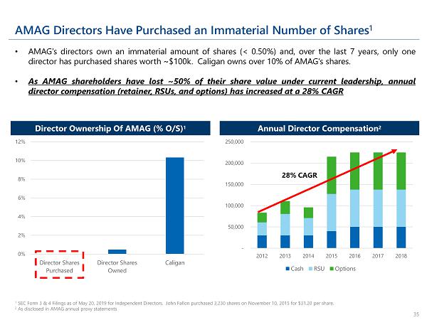 34 Action Rationale Significant Board Refreshment • Given AMAG’s absolute and relative underperformance, AMAG would benefit from the fresh perspective of a new set of independent directors that includes both (i) directors with significant pharmaceutical expertise and public company experience and (ii) direct representation for AMAG shareholders • Caligan is proposing 4 new directors, 3 independent of Caligan Comprehensive Review of Strategic Alternatives • Post board refreshment, AMAG should conduct a comprehensive review of strategic alternatives of its asset portfolio • The nephrology, women’s health, and hematology assets cannot leverage a single commercial infrastructure (or require additional direct - to - consumer marketing spending that questions the need for a sales force) questioning the logic of having multiple subscale therapeutic focuses Immediate Rationalization of Commercial Footprint to Achieve Positive EBITDA • Given the spending and pipeline overhang with the investment community, the quickest way to re - build trust is to immediately get the company to profitability • Positive steps include exploring non - traditional ways and partnerships to monetize Intrarosa and Vyleesi and establishing risk - sharing development partnerships on ciraparantag and AMAG - 423 that alleviate the R&D burden on AMAG Monetize Feraheme International Rights • Given the hypophosphatemia benefits vs . Injectafer that the non - inferiority study demonstrated, this would seem like an opportune time to explore a new partnership (Vifor/Daiichi provides a template) • A low - risk business development initiative could provide substantial upside to AMAG shareholders Caligan Action Plan