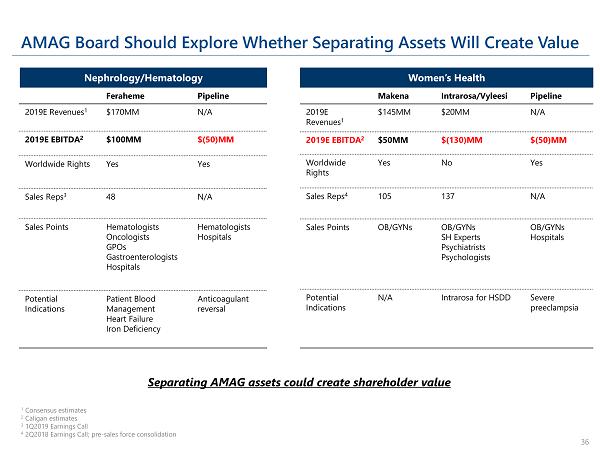 AMAG Directors Have Purchased an Immaterial Number of Shares 1 35 • AMAG’s directors own an immaterial amount of shares (< 0 . 50 % ) and, over the last 7 years, only one director has purchased shares worth ~ $ 100 k . Caligan owns over 10 % of AMAG’s shares . • As AMAG shareholders have lost ~ 50 % of their share value under current leadership, annual director compensation (retainer, RSUs, and options) has increased at a 28 % CAGR 1 SEC Form 3 & 4 Filings as of May 20, 2019 for Independent Directors. John Fallon purchased 3,230 shares on November 10, 2015 f or $31.20 per share. 2 As disclosed in AMAG annual proxy statements Director Ownership Of AMAG (% O/S) 1 Annual Director Compensation 2 0% 2% 4% 6% 8% 10% 12% Director Shares Purchased Director Shares Owned Caligan - 50,000 100,000 150,000 200,000 250,000 2012 2013 2014 2015 2016 2017 2018 Cash RSU Options 28% CAGR
