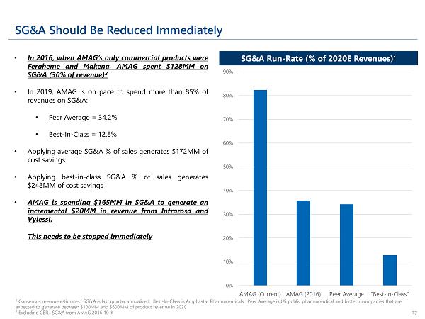 AMAG Board Should Explore Whether Separating Assets Will Create Value 36 1 Consensus estimates 2 Caligan estimates 3 1Q2019 Earnings Call 4 2Q2018 Earnings Call; pre - sales force consolidation Nephrology/Hematology Women’s Health Feraheme Pipeline 2019E Revenues 1 $170MM N/A 2019E EBITDA 2 $100MM $(50)MM Worldwide Rights Yes Yes Sales Reps 3 48 N/A Sales Points Hematologists Oncologists GPOs Gastroenterologists Hospitals Hematologists Hospitals Potential Indications Patient Blood Management Heart Failure Iron Deficiency Anticoagulant reversal Makena Intrarosa / Vyleesi Pipeline 2019E Revenues 1 $145MM $20MM N/A 2019E EBITDA 2 $50MM $(130)MM $(50)MM Worldwide Rights Yes No Yes Sales Reps 4 105 137 N/A Sales Points OB/GYNs OB/GYNs SH Experts Psychiatrists Psychologists OB/GYNs Hospitals Potential Indications N/A Intrarosa for HSDD Severe preeclampsia Separating AMAG assets could create shareholder value