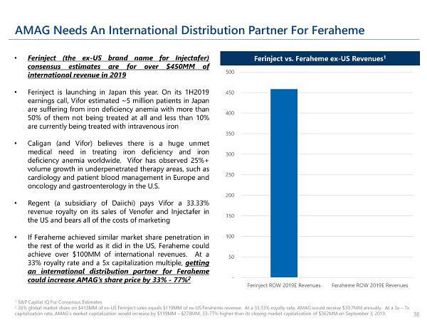 AMAG Needs An International Distribution Partner For Feraheme 38 1 S&P Capital IQ For Consensus Estimates 2 26% global market share on $413MM of ex - US Ferinject sales equals $119MM of ex - US Feraheme revenue. At a 33.33% royalty rate, AMAG would receive $39.7MM annually. At a 3x – 7x capitalization rate, AMAG’s market capitalization would increase by $119MM – $278MM, 33 - 77% higher than its closing market capit alization of $362MM on September 3, 2019. Ferinject vs. Feraheme ex - US Revenues 1 - 50 100 150 200 250 300 350 400 450 500 Ferinject ROW 2019E Revenues Feraheme ROW 2019E Revenues • Ferinject (the ex - US brand name for Injectafer ) consensus estimates are for over $ 450 MM of international revenue in 2019 • Ferinject is launching in Japan this year . On its 1 H 2019 earnings call, Vifor estimated ~ 5 million patients in Japan are suffering from iron deficiency anemia with more than 50 % of them not being treated at all and less than 10 % are currently being treated with intravenous iron • Caligan (and Vifor ) believes there is a huge unmet medical need in treating iron deficiency and iron deficiency anemia worldwide . Vifor has observed 25 % + volume growth in underpenetrated therapy areas, such as cardiology and patient blood management in Europe and oncology and gastroenterology in the U . S . • Regent (a subsidiary of Daiichi) pays Vifor a 33 . 33 % revenue royalty on its sales of Venofer and Injectafer in the US and bears all of the costs of marketing • If Feraheme achieved similar market share penetration in the rest of the world as it did in the US, Feraheme could achieve over $ 100 MM of international revenues . At a 33 % royalty rate and a 5 x capitalization multiple, getting an international distribution partner for Feraheme could increase AMAG’s share price by 33 % - 77 % 2