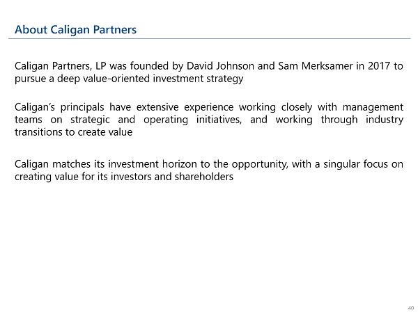 About Caligan Partners 40 Caligan Partners, LP was founded by David Johnson and Sam Merksamer in 2017 to pursue a deep value - oriented investment strategy Caligan’s principals have extensive experience working closely with management teams on strategic and operating initiatives, and working through industry transitions to create value Caligan matches its investment horizon to the opportunity, with a singular focus on creating value for its investors and shareholders
