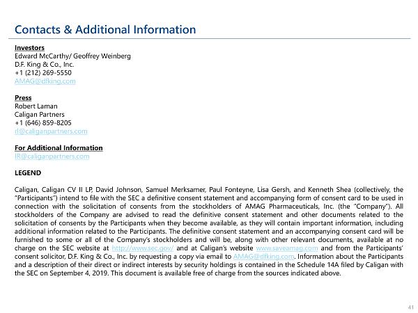 Contacts & Additional Information 41 Investors Edward McCarthy/ Geoffrey Weinberg D . F . King & Co . , Inc . + 1 ( 212 ) 269 - 5550 AMAG@dfking . com Press Robert Laman Caligan Partners + 1 ( 646 ) 859 - 8205 rl@caliganpartners . com F or Additional Information IR@caliganpartners . com LEGEND Caligan, Caligan CV II LP, David Johnson, Samuel Merksamer, Paul Fonteyne, Lisa Gersh , and Kenneth Shea (collectively, the “Participants”) intend to file with the SEC a definitive consent statement and accompanying form of consent card to be used in connection with the solicitation of consents from the stockholders of AMAG Pharmaceuticals, Inc . (the “Company”) . All stockholders of the Company are advised to read the definitive consent statement and other documents related to the solicitation of consents by the Participants when they become available, as they will contain important information, including additional information related to the Participants . The definitive consent statement and an accompanying consent card will be furnished to some or all of the Company’s stockholders and will be, along with other relevant documents, available at no charge on the SEC website at http : //www . sec . gov/ and at Caligan’s website www . saveamag . com and from the Participants’ consent solicitor, D . F . King & Co . , Inc . by requesting a copy via email to AMAG@dfking . com . Information about the Participants and a description of their direct or indirect interests by security holdings is contained in the Schedule 14 A filed by Caligan with the SEC on September 4 , 2019 . This document is available free of charge from the sources indicated above .