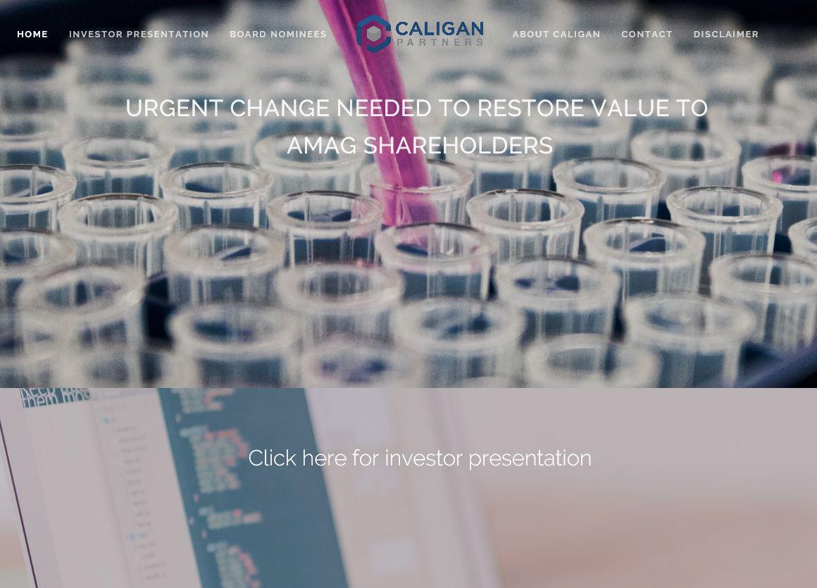 David Johnson, Managing Partner of Caligan, issued the following statement: “We believe urgent change is needed at AMAG to reverse the sharp share price decline caused by the Company’s misguided strategic priorities. Caligan’s highly qualified nominees will conduct a comprehensive review of AMAG’s product portfolio, research and development priorities, and SG&A spending.”