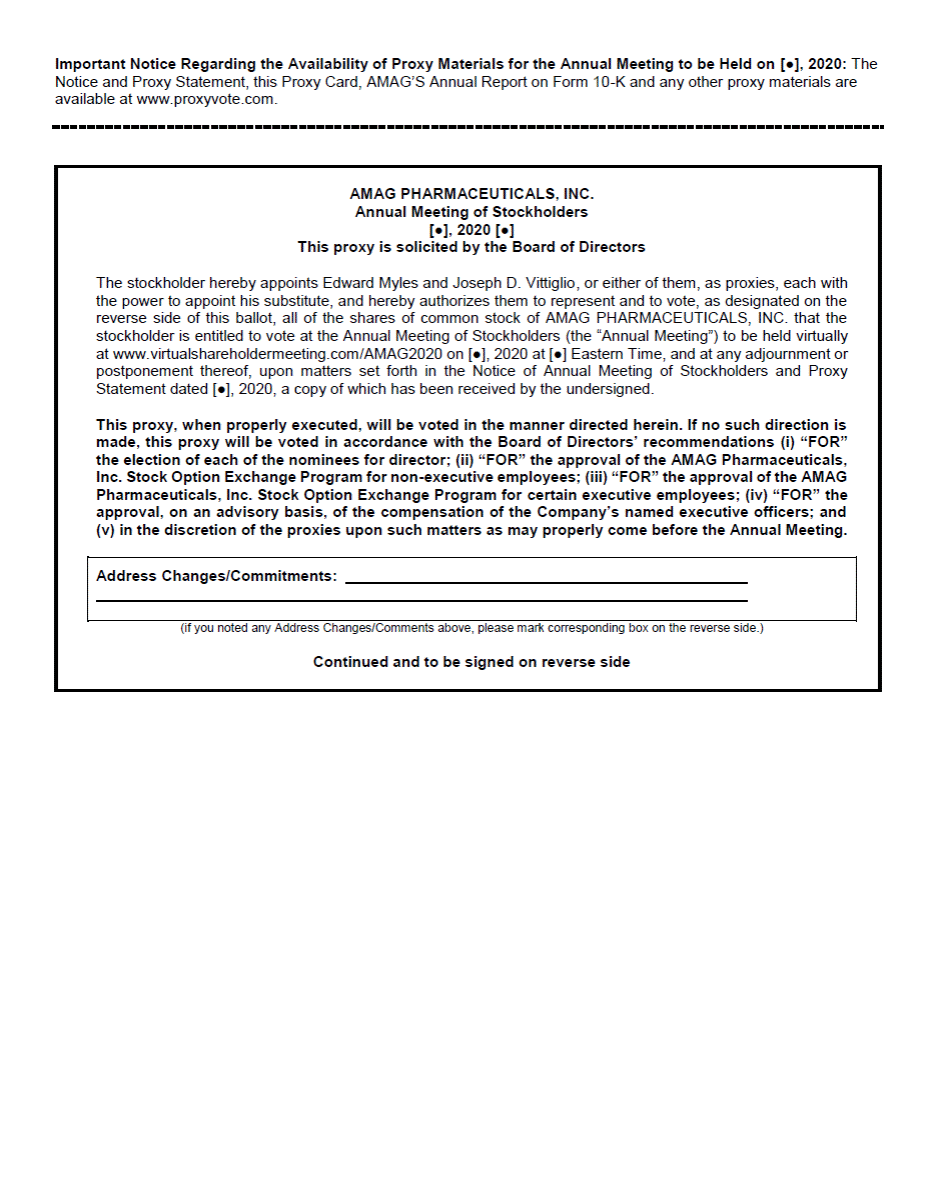 Important Notice Regarding the Availability of Proxy Materials for the Annual Meeting to be Held on [•], 2020: The Notice and Proxy Statement, this Proxy Card, AMAG’S Annual Report on Form 10-K and any other proxy materials are available at www.proxyvote.com. AMAG PHARMACEUTICALS, INC. Annual Meeting of Stockholders [•], 2020 [•] This proxy is solicited by the Board of Directors The stockholder hereby appoints Edward Myles and Joseph D. Vittiglio, or either of them, as proxies, each with the power to appoint his substitute, and hereby authorizes them to represent and to vote, as designated on the reverse side of this ballot, all of the shares of common stock of AMAG PHARMACEUTICALS, INC. that the stockholder is entitled to vote at the Annual Meeting of Stockholders (the “Annual Meeting”) to be held virtually at www.virtualshareholdermeeting.com/AMAG2020 on [•], 2020 at [•] Eastern Time, and at any adjournment or postponement thereof, upon matters set forth in the Notice of Annual Meeting of Stockholders and Proxy Statement dated [•], 2020, a copy of which has been received by the undersigned. This proxy, when properly executed, will be voted in the manner directed herein. If no such direction is made, this proxy will be voted in accordance with the Board of Directors’ recommendations (i) “FOR” the election of each of the nominees for director; (ii) “FOR” the approval of the AMAG Pharmaceuticals, Inc. Stock Option Exchange Program for non-executive employees; (iii) “FOR” the approval of the AMAG Pharmaceuticals, Inc. Stock Option Exchange Program for certain executive employees; (iv) “FOR” the approval, on an advisory basis, of the compensation of the Company’s named executive officers; and (v) in the discretion of the proxies upon such matters as may properly come before the Annual Meeting. (if you noted any Address Changes/Comments above, please mark corresponding box on the reverse side.) Continued and to be signed on reverse side Address Changes/Commitments: