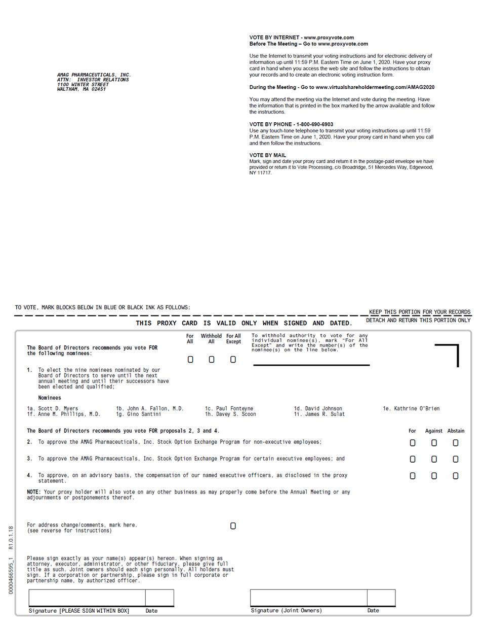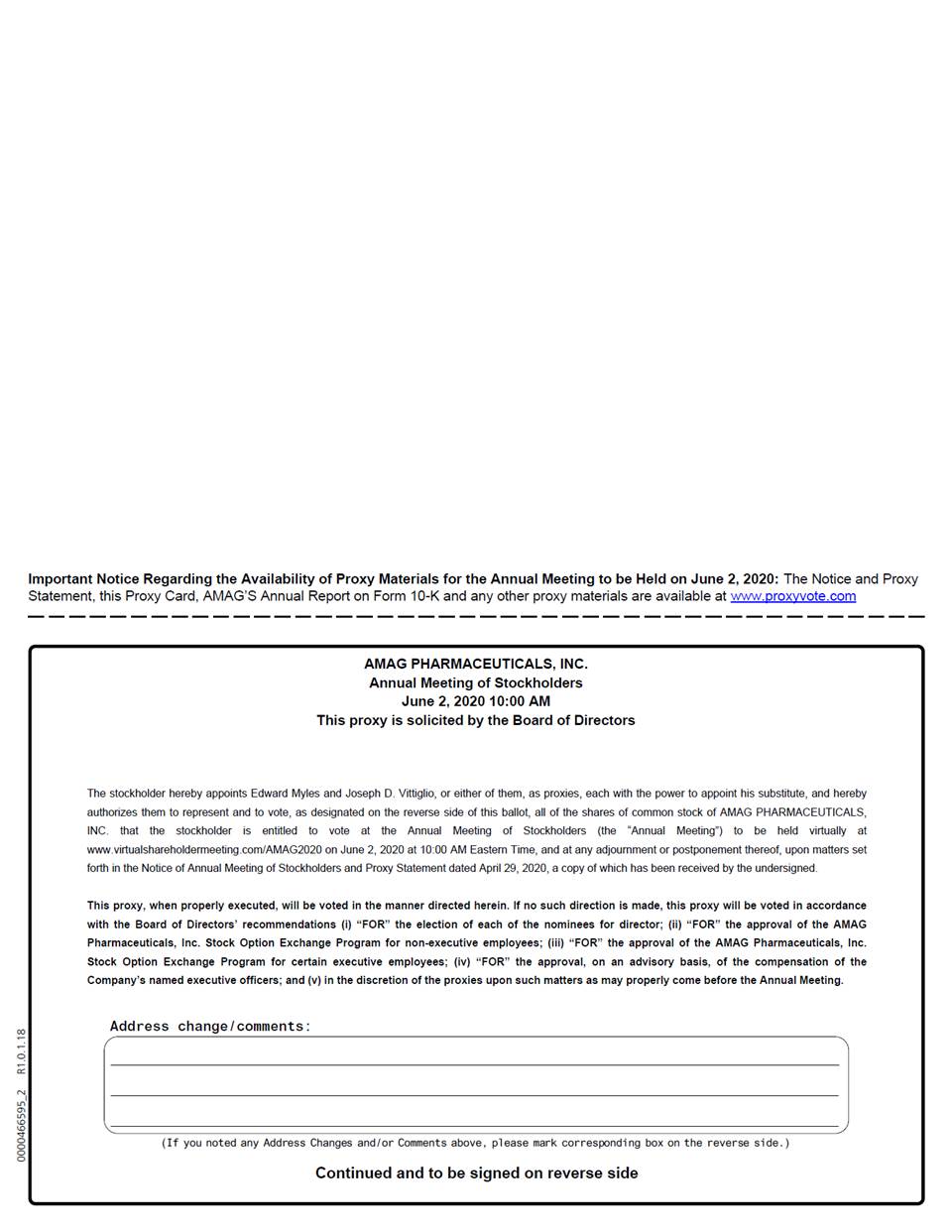 Important Notice Regarding the Availability of Proxy Materials for the Annual Meeting to be Held on June 2, 2020: The Notice and Proxy Statement, this Proxy Card, AMAG’S Annual Report on Form 10-K and any other proxy materials are available at www.proxyvote.com AMAG PHARMACEUTICALS, INC. Annual Meeting of Stockholders June 2, 2020 10:00 AM This proxy is solicited by the Board of Directors The stockholder hereby appoints Edward Myles and Joseph D. Vittiglio, or either of them, as proxies, each with the power to appoint his substitute, and hereby authorizes them to represent and to vote, as designated on the reverse side of this ballot, all of the shares of common stock of AMAG PHARMACEUTICALS, INC. that the stockholder is entitled to vote at the Annual Meeting of Stockholders (the “Annual Meeting”) to be held virtually at www.virtualshareholdermeeting.com/AMAG2020 on June 2, 2020 at 10:00 AM Eastern Time, and at any adjournment or postponement thereof, upon matters set forth in the Notice of Annual Meeting of Stockholders and Proxy Statement dated April 29, 2020, a copy of which has been received by the undersigned. This proxy, when properly executed, will be voted in the manner directed herein. If no such direction is made, this proxy will be voted in accordance with the Board of Directors’ recommendations (i) “FOR” the election of each of the nominees for director; (ii) “FOR” the approval of the AMAG Pharmaceuticals, Inc. Stock Option Exchange Program for non-executive employees; (iii) “FOR” the approval of the AMAG Pharmaceuticals, Inc. Stock Option Exchange Program for certain executive employees; (iv) “FOR” the approval, on an advisory basis, of the compensation of the Company’s named executive officers; and (v) in the discretion of the proxies upon such matters as may properly come before the Annual Meeting. Address change/comments: (If you noted any Address Changes and/or Comments above, please mark corresponding box on the reverse side.) Continued and to be signed on reverse side 0000466595_2 R1.0.1.18