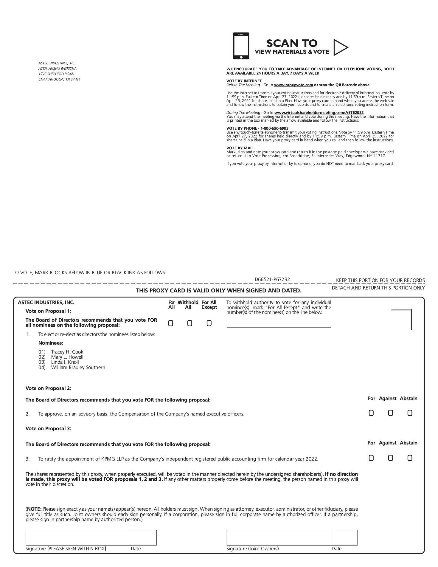 As we hopefully look at the pandemic in the rear-view mirror, we cordially invite you to join us for the 2022 Annual Meeting of shareholders of Astec Industries, Inc. (“Astec” or the “Company”) to be held on Thursday, April 28, 2022 at 10:00 a.m. EDT virtually over the Internet at www.virtualshareholdermeeting.com/ASTE2022. We decided to hold the 2022 Annual Meeting as a virtual meeting because we believe that it will offer expanded access to shareholders who may otherwise not attend in person.