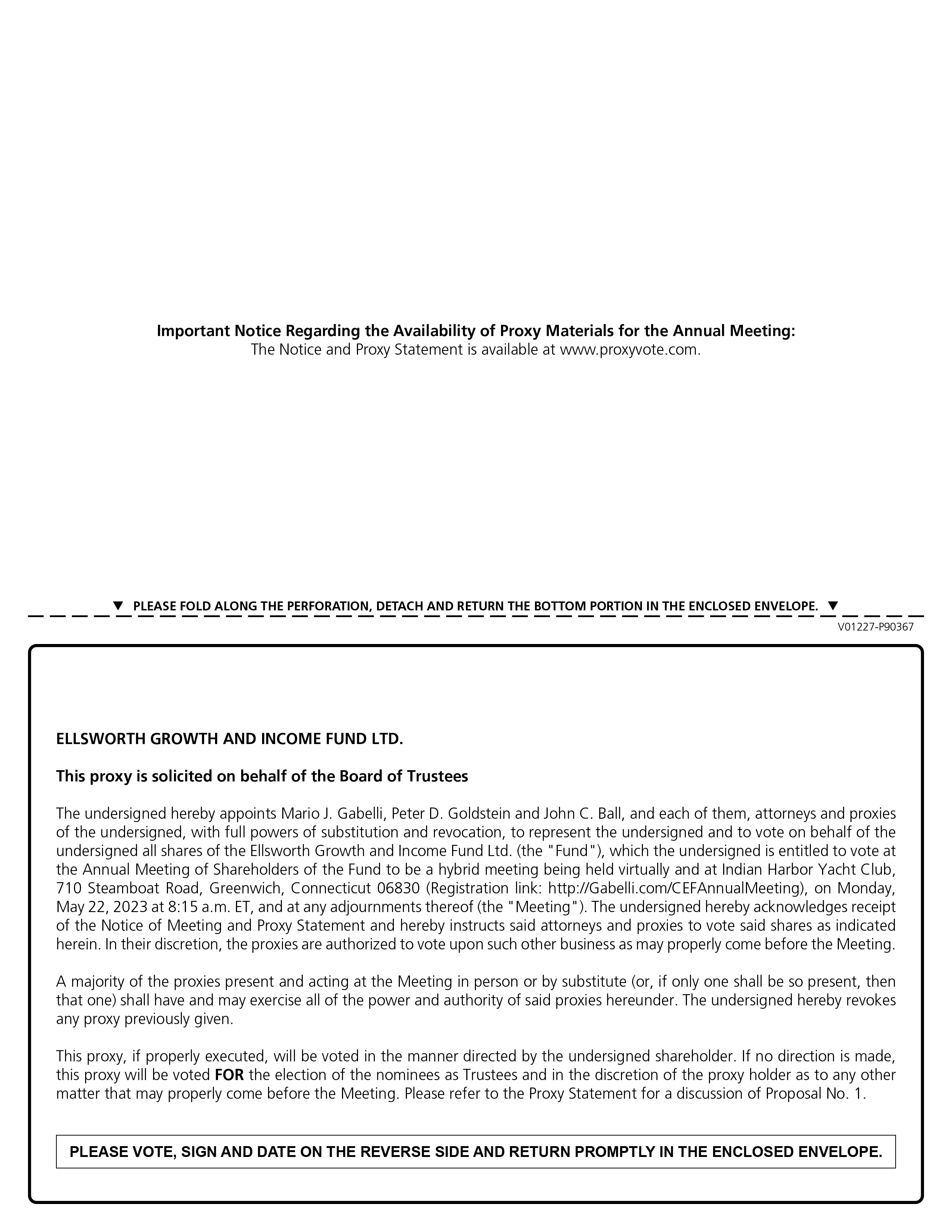 Notice is hereby given that the Annual Meeting of Shareholders of the Ellsworth Growth and Income Fund Ltd., a Delaware statutory trust (the “Fund”), will be held on Monday, May 22, 2023, at 8:15 a.m., ET, at Indian Harbor Yacht Club, 710 Steamboat Road, Greenwich, Connecticut, 06830 and virtually by Internet webcast (the “Meeting”), and at any adjournments or postponements thereof for the following purposes: