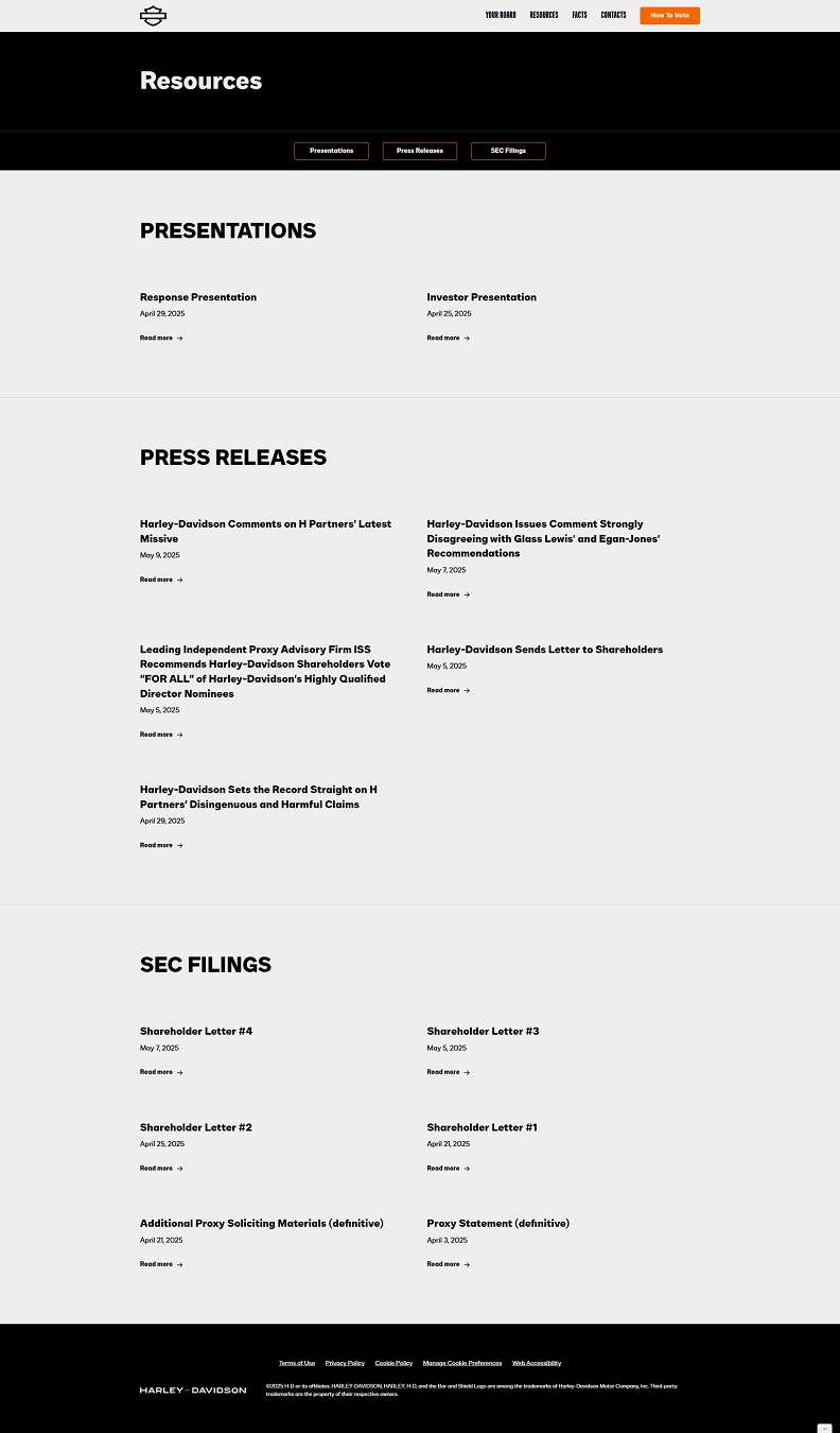 Harley-Davidson, Inc. (the “Company”) maintains a website, VoteHarleyDavidson.com, in connection with the Company’s 2025 annual meeting of shareholders. On May 9, 2025, the Company revised the Resources page of the website. A copy of the revised website page is filed herewith.