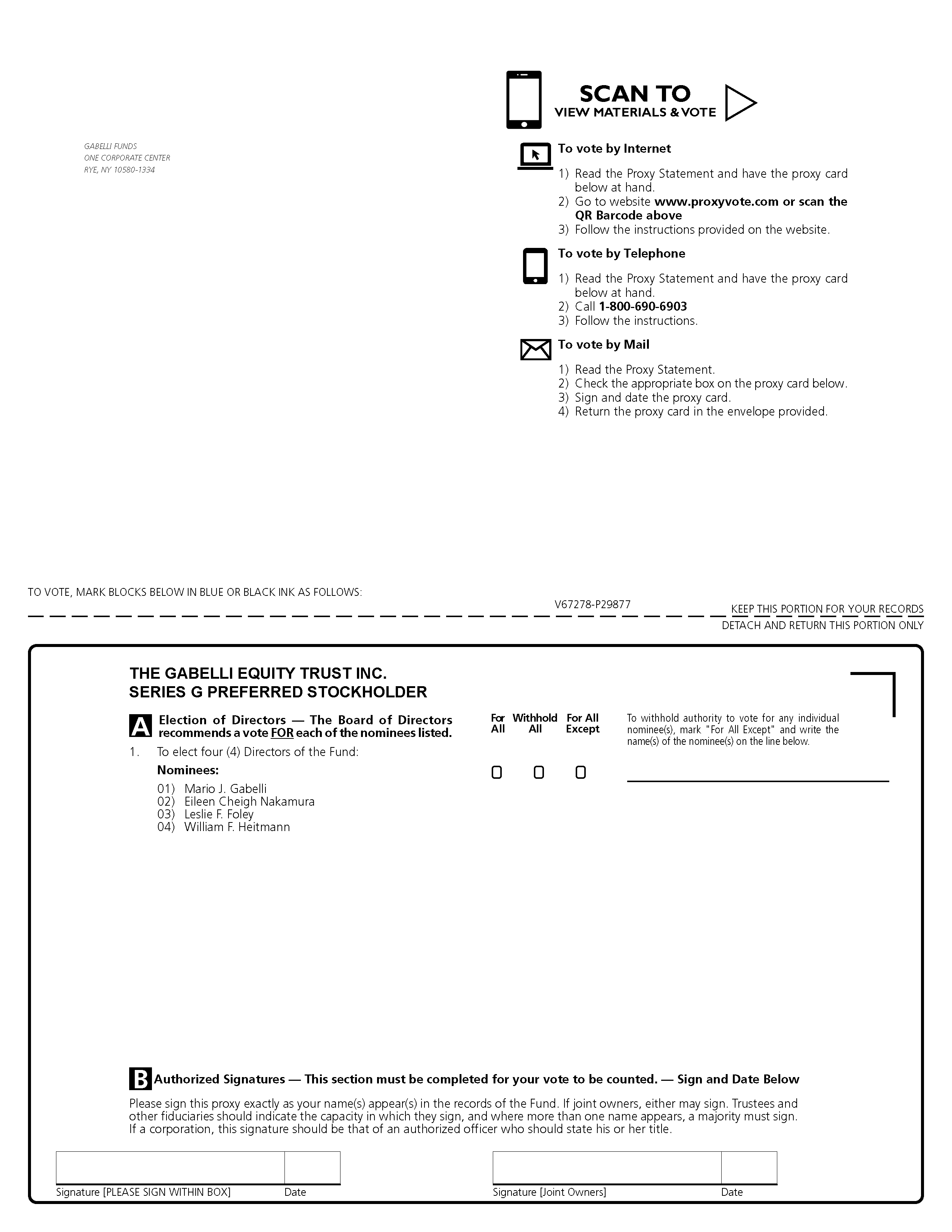 Notice is hereby given that the Annual Meeting of Stockholders of The Gabelli Equity Trust Inc., a Maryland corporation (the “Fund”), will be held on Monday, May 12, 2025, at 9:15 a.m., ET, at Indian Harbor Yacht Club, 710 Steamboat Road, Greenwich, Connecticut, 06830 and virtually by Internet webcast (the “Meeting”), and at any adjournments or postponements thereof for the following purposes: