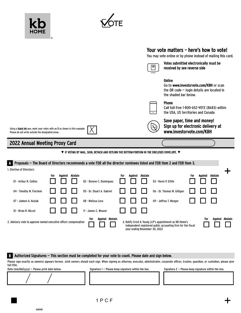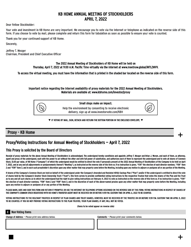 Important Notice Regarding the Availability of Proxy Materials for the Stockholder Meeting to be Held on April 7, 2022: Our Proxy Statement and Annual Report are available at www.kbhome.com/investor/proxy.