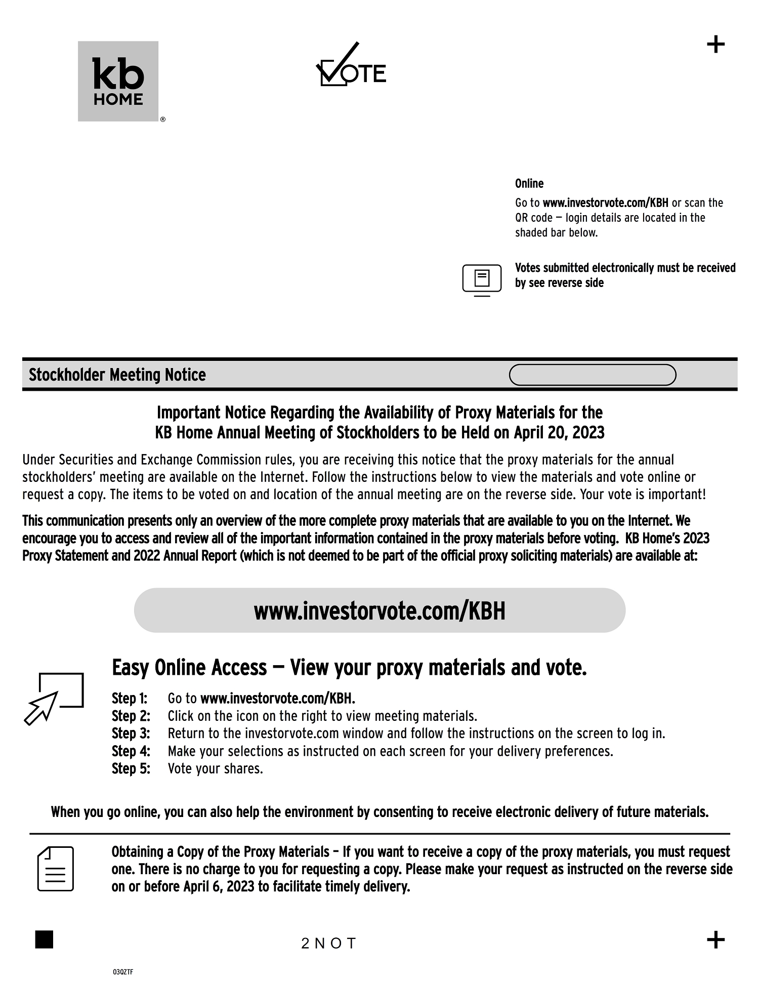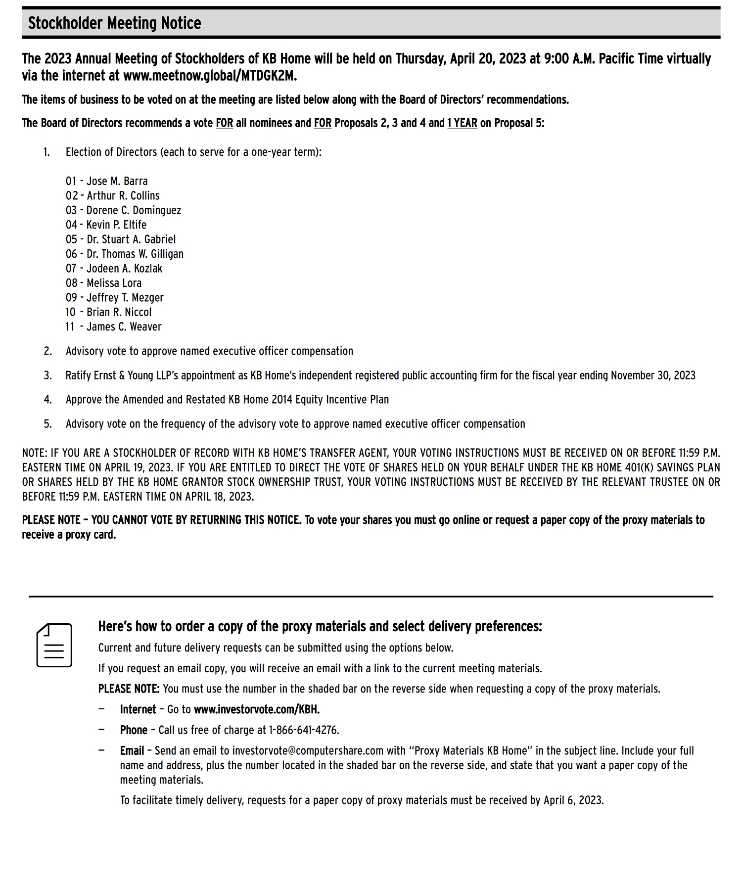 If on February 24, 2023, you held KB Home common stock (either directly or through our 401(k) Savings Plan), or had common stock options, you will receive a proxy/voting instruction form(s) and/or a notice card(s) with instructions on how to access the proxy materials for the meeting and vote.