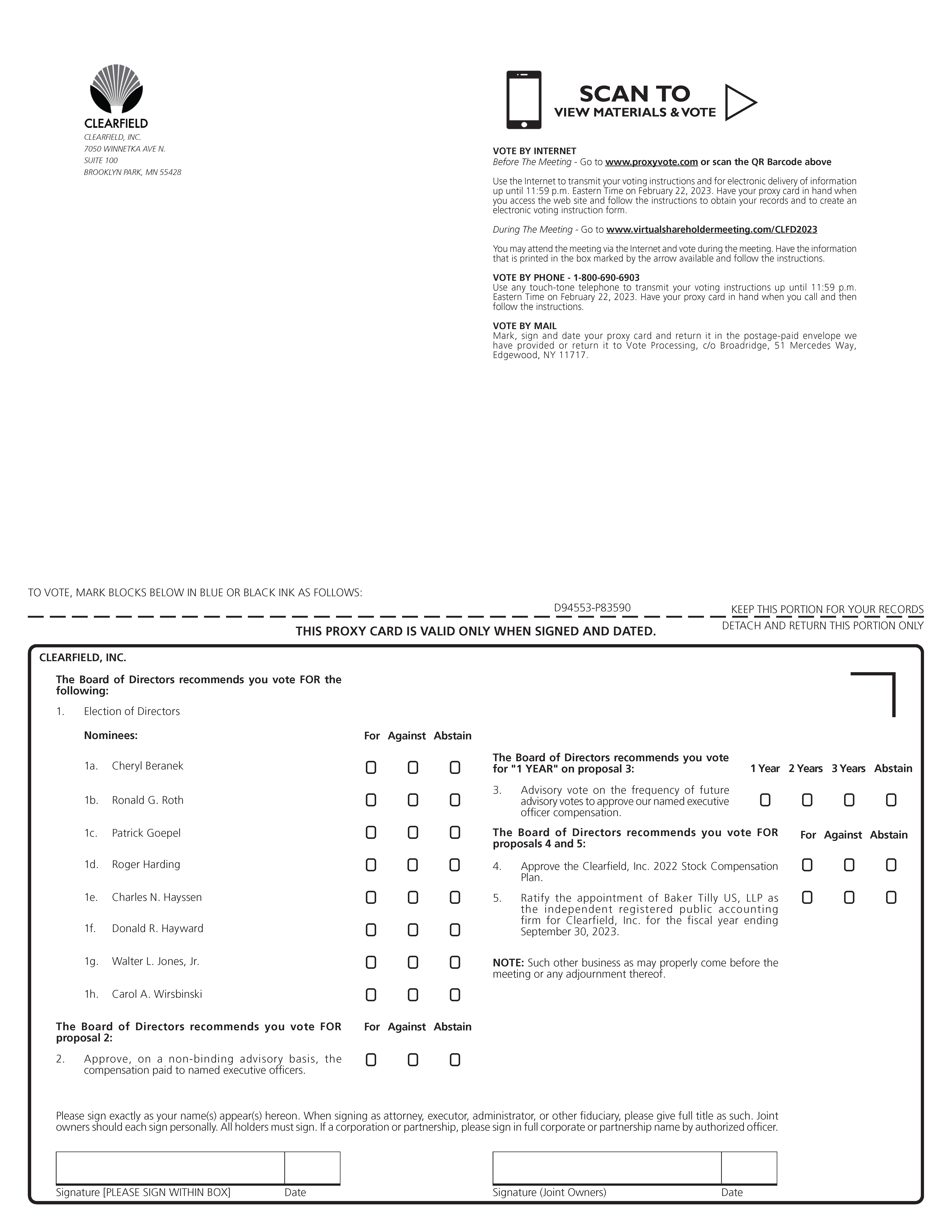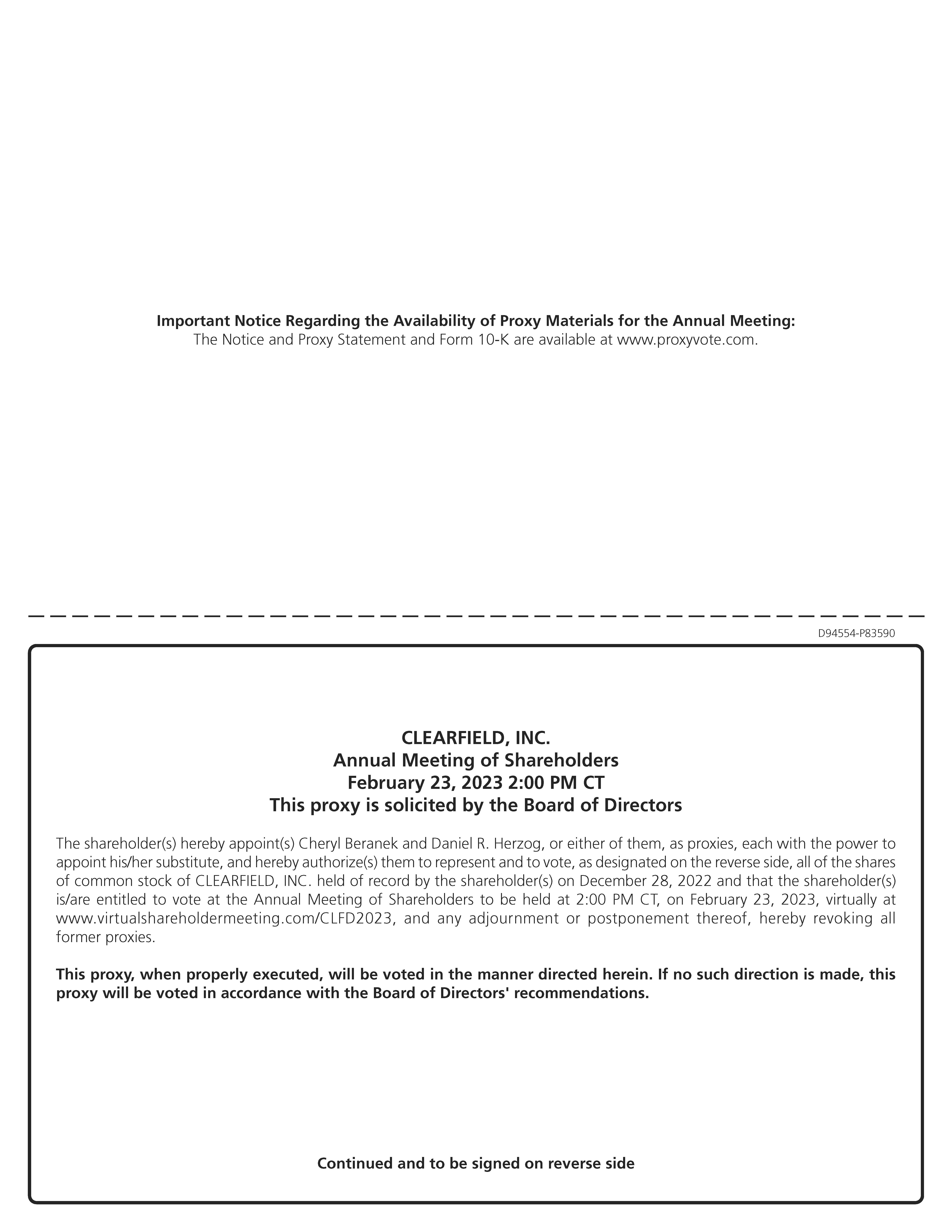 NOTICE IS HEREBY GIVEN that the Annual Meeting of Shareholders of Clearfield, Inc., a Minnesota corporation, will be held on Thursday, February 23, 2023, at 2:00 p.m. Central Standard Time for the following purposes: