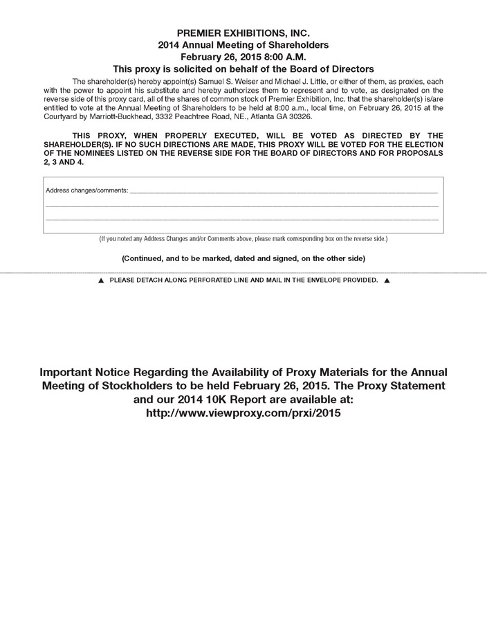 The annual meeting of shareholders of Premier Exhibitions, Inc. will be held at the Courtyard by Marriott – Buckhead, 3332 Peachtree Road, N.E., Atlanta, GA 30326 on February 26, 2015 at 8:00 a.m., local time, for the following purposes, which are more fully described in the accompanying proxy statement: